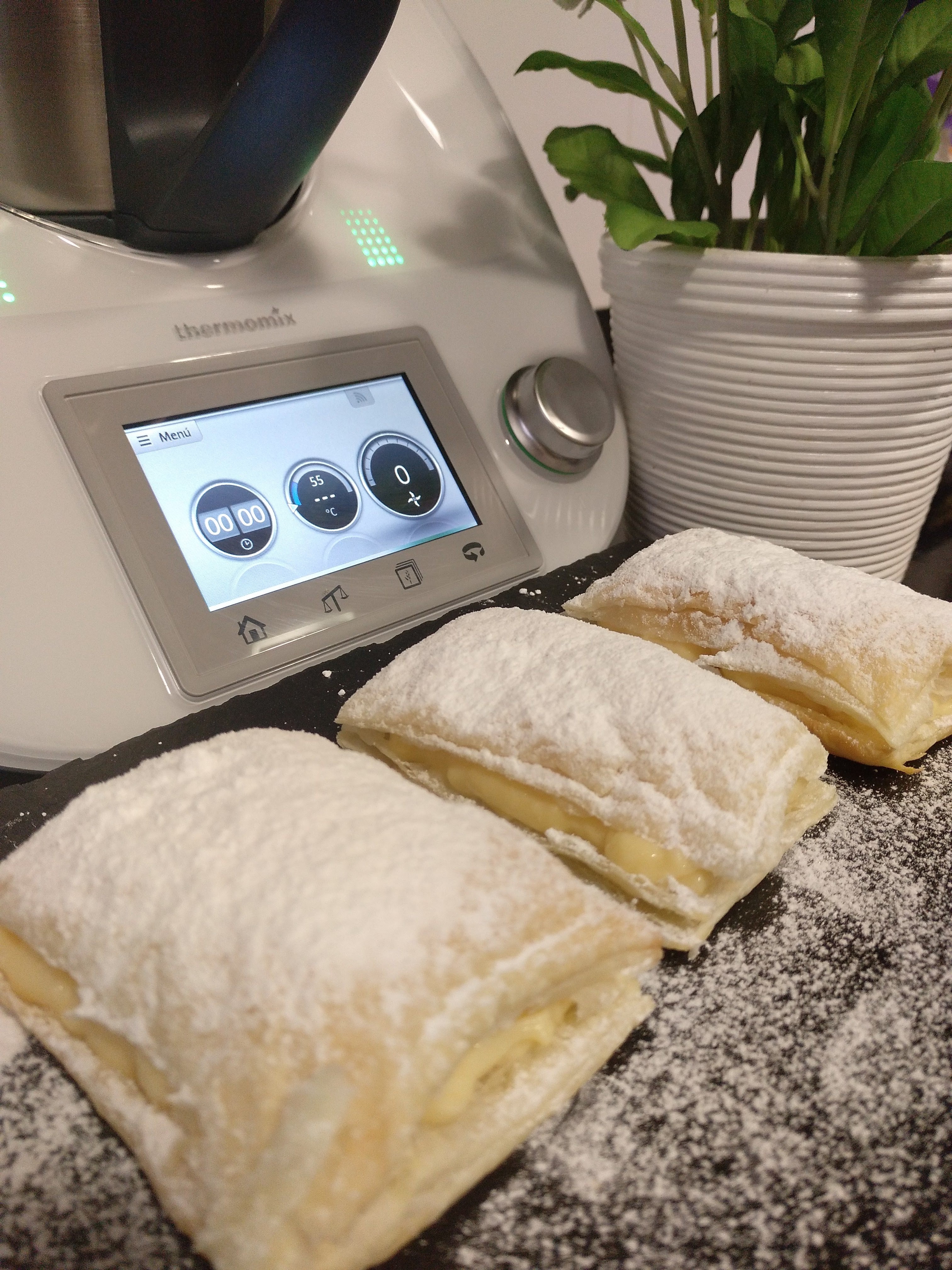 2. Poner hojaldre en la bandeja del horno, hacer cuadrados con cuchillo, tipo rectángulo o cuadrado y dejar en el horno a 180º / 15 minutos o dorados, sacar del horno y cuando enfrían, abrir con el cuchillo y rellenarlas con la crema, espolvorear con azúcar glass.