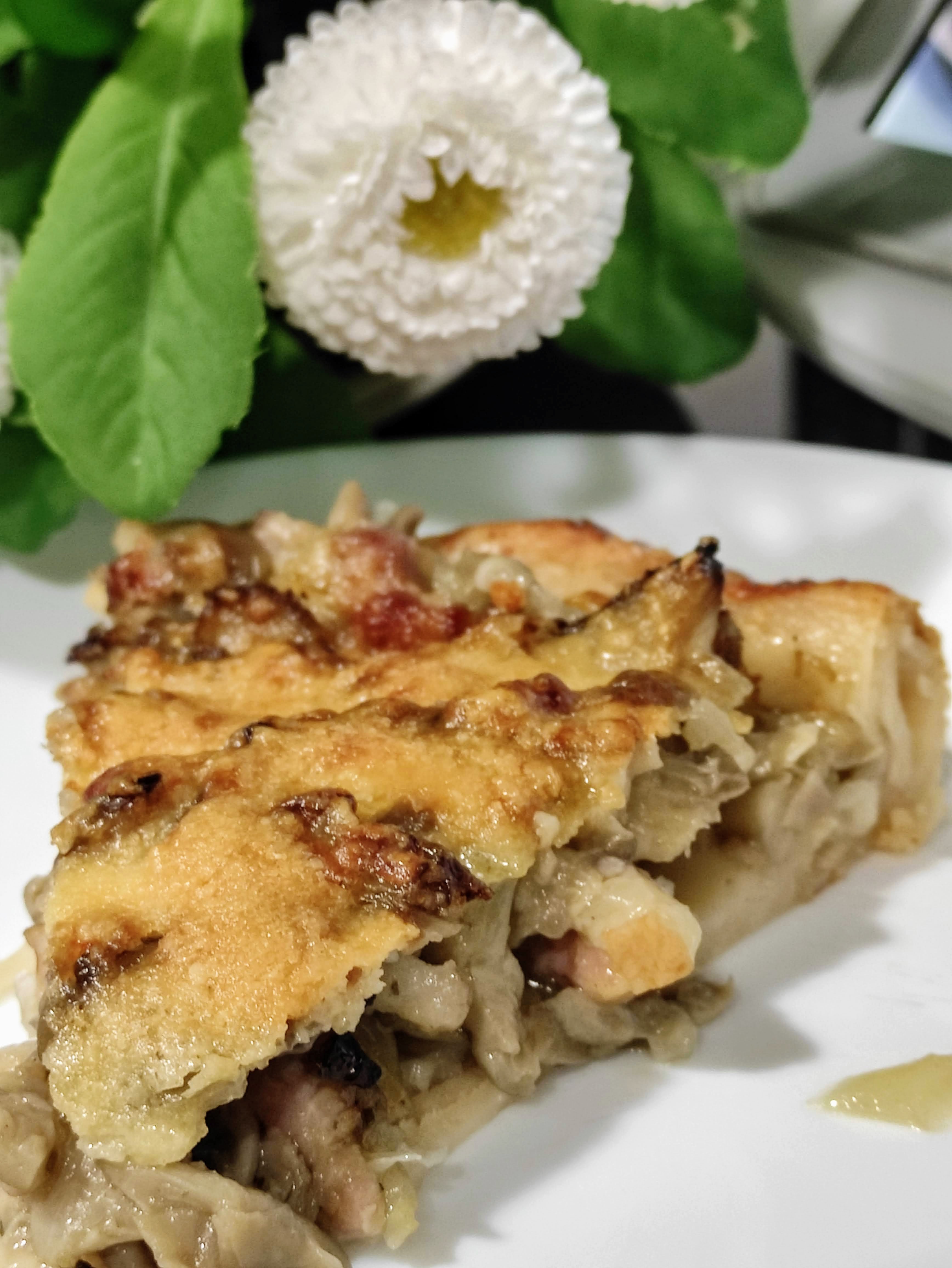• 100 gr queso emmental o curado ( yo puse curado) •150gr cebolla a trozos •3 dientes ajo • 30gr aceite oliva •400 gr setas frescas a trozos pequeños o champiñones ( yo la puse con setas) • 100 gr bacon o jamón serrano o pavo a cuadraditos • Sal y pimienta molida • 1 cucharadita hierbas provenzales • masa hojaldre normal o sin gluten ( yo puse sin gluten)