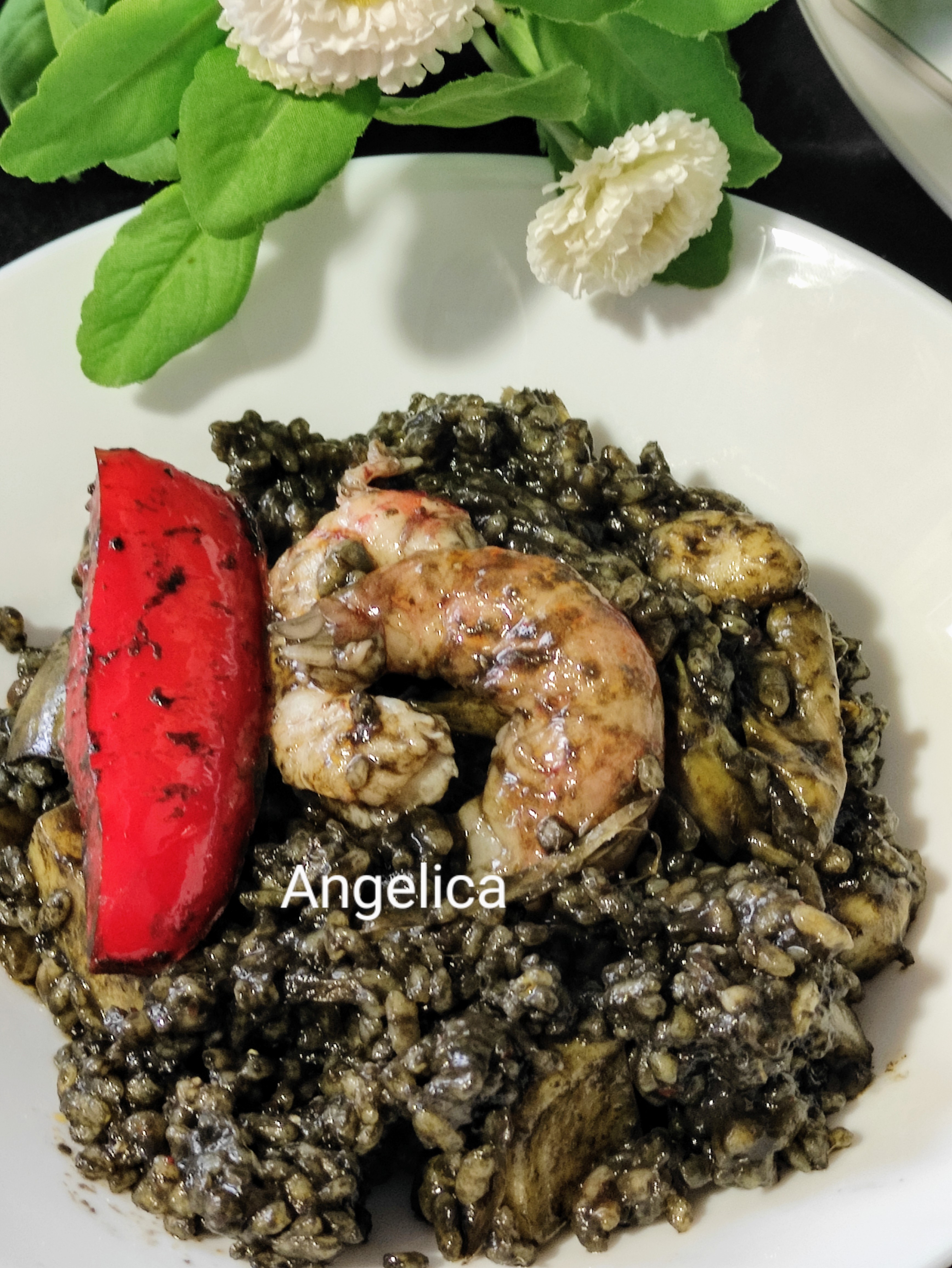 Arroz negro con gambones, sepia y verduras con thermomix