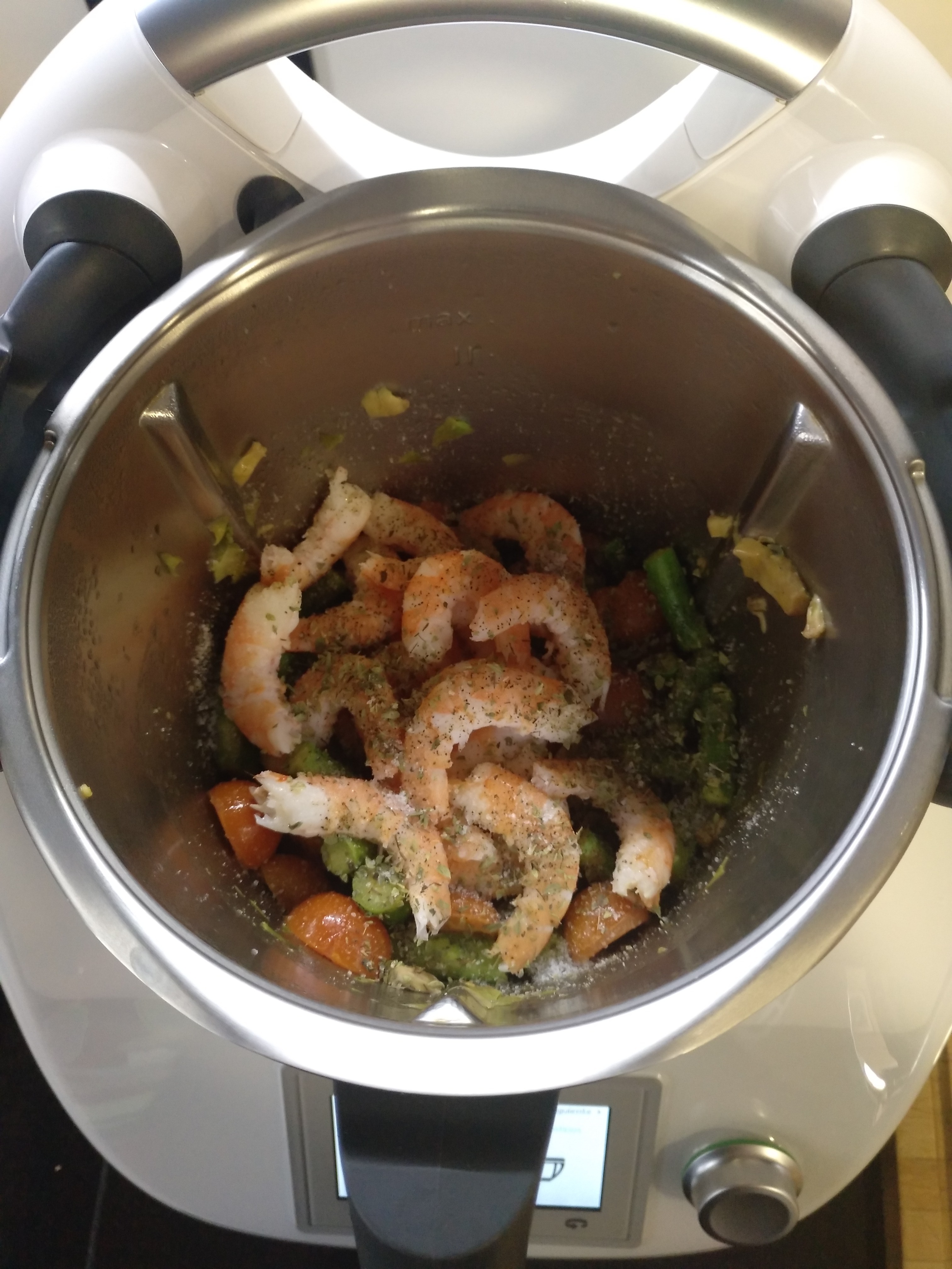 3. Añada los langostinos, la albahaca, cortada a mano, sal pimienta. Sofría 5 min/120º o varoma tm31/ giro a la izd/ vel 1. Retire del vaso y reserve