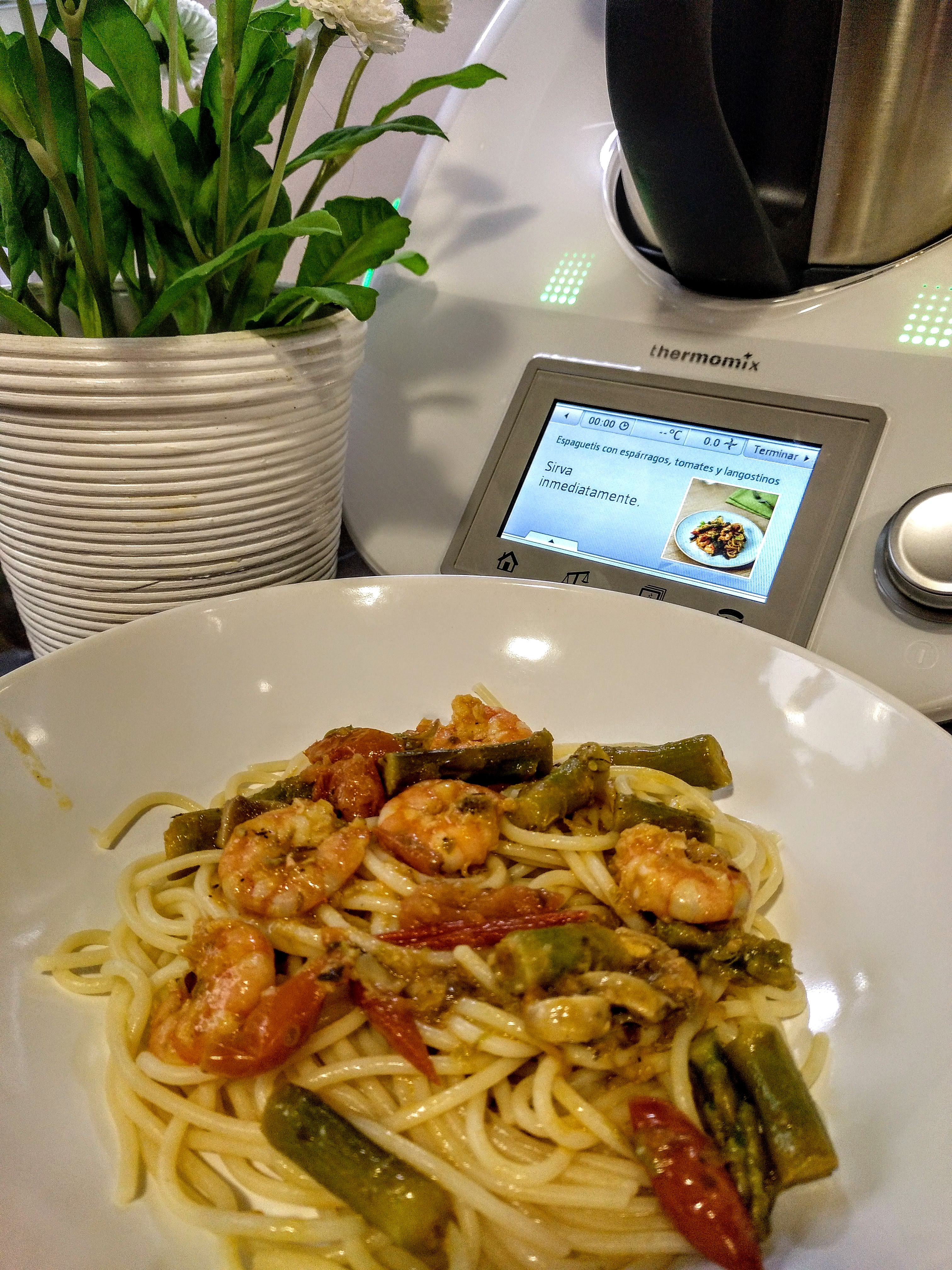 ESPAGUETIS CON ESPÁRRAGOS, TOMATES CHERRY Y LANGOSTINOS