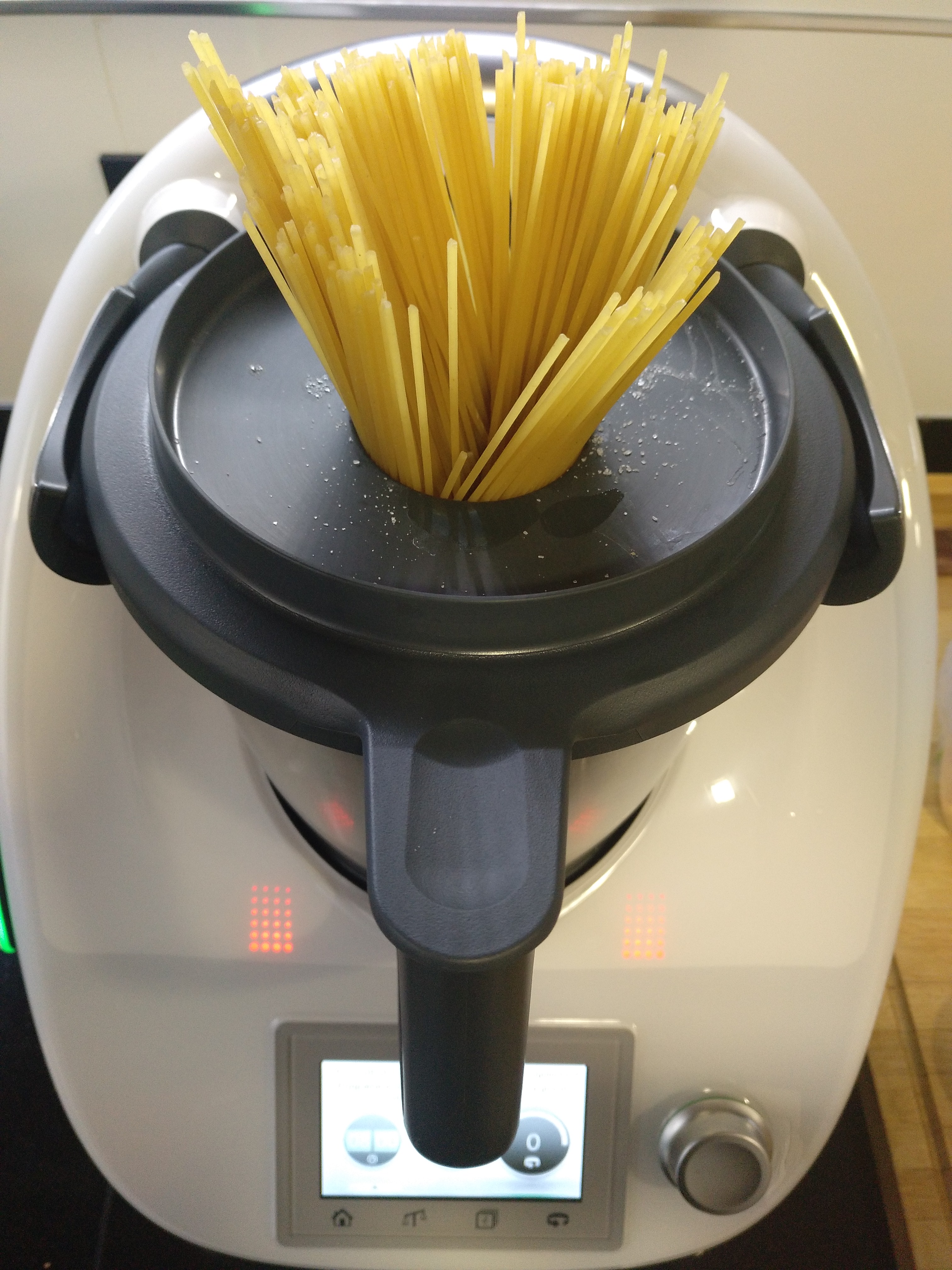 5. Retire el cubilete y añada por la abertura 1 cucharadita de sal y los espaguetis, Programe el tiempo indicado en el paquete / 100º/ giro a la izda/ vel 1. Escurra la pasta a través del cestillo y mézclela con la salsa de espárragos, tomates y langostinos.