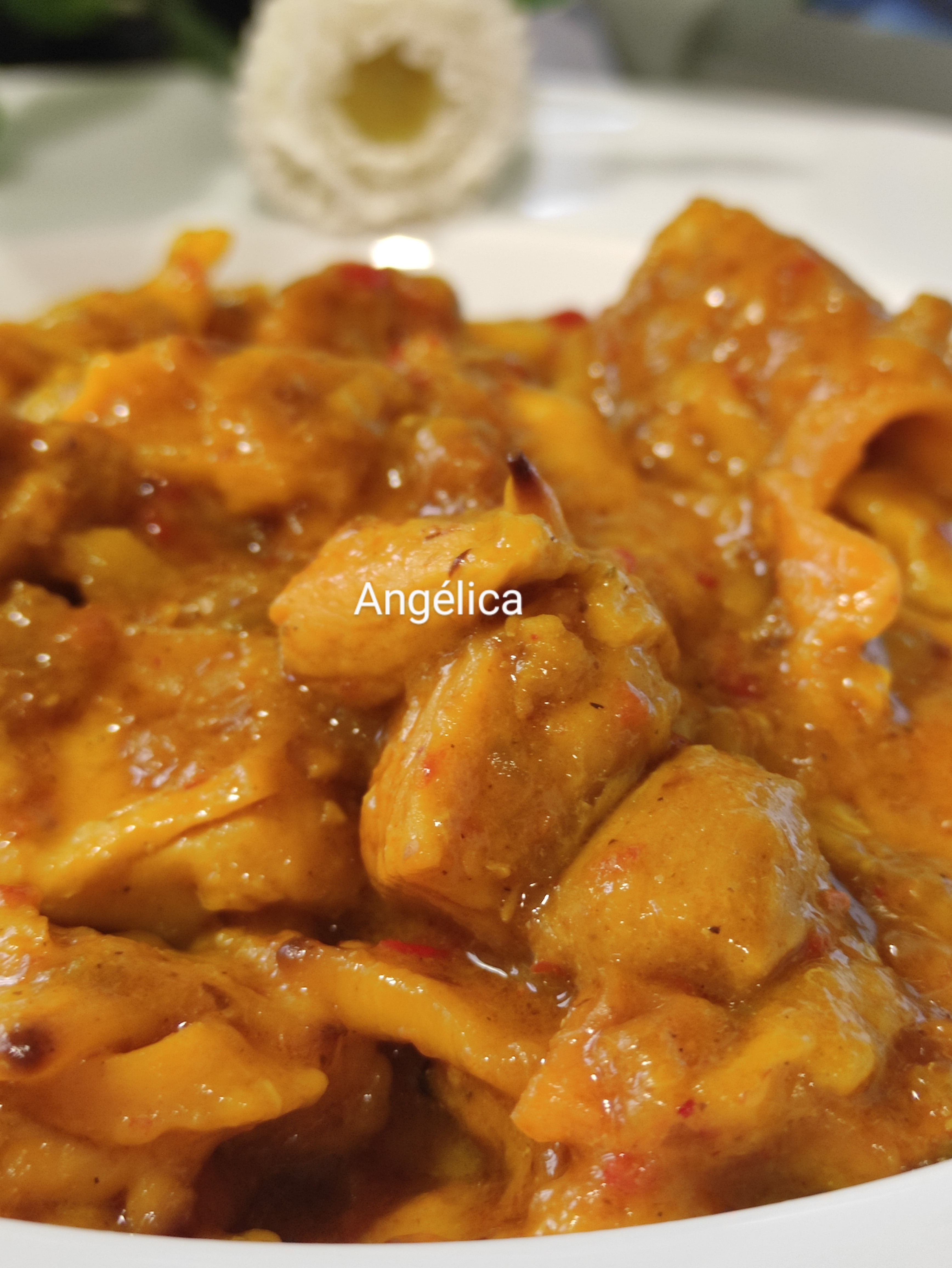 • 100 g aceite de oliva •colorante • 2 ñoras sin semillas • 2 dientes ajo • 120 g cebolla en trozos •120 g pimiento verde en trozos •120 g pimiento rojo en trozos • 100 gr tomate triturado • 300 g pollo deshuesado en trozos • 300 g de tortas de gazpacho troceadas •2 cucharaditas tomillo seco o pebrella • 2 cucharaditas orégano seco • 1 - 2 pellizcos de pimienta molida • sal • 1000 l caldo carne