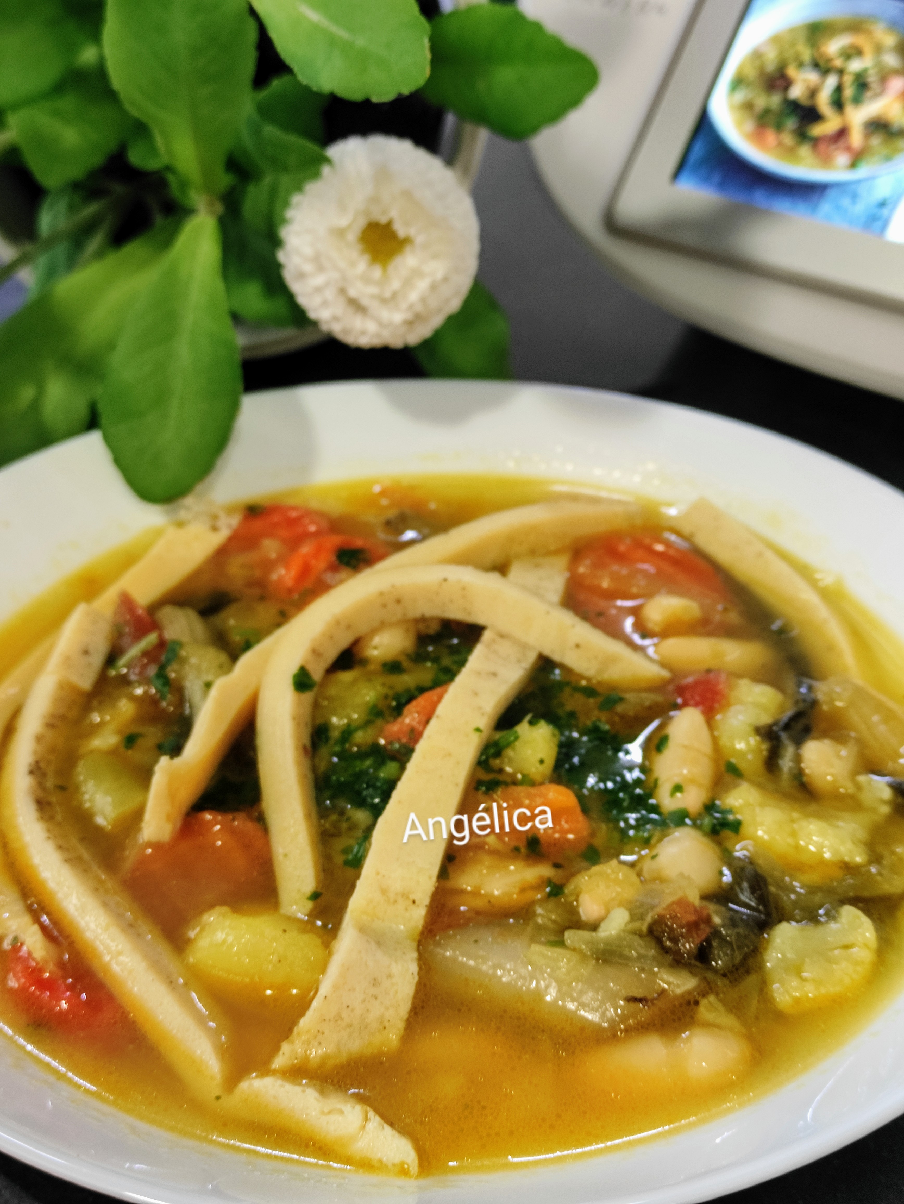 6. Añadir las judías blancas , mezclar con la espátula. Cortar la tortilla en tiras finas, y ponerlas sobre la sopa. Espolvorear con perejil