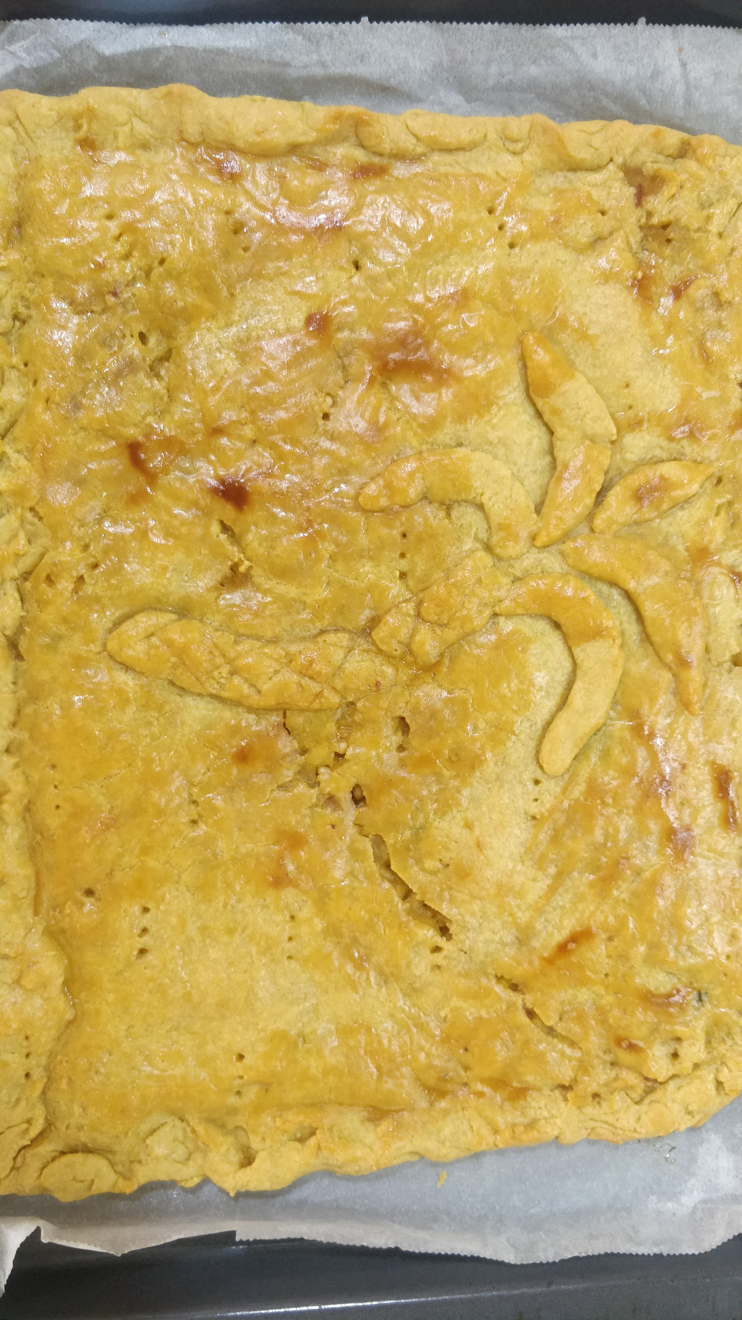 3-Separar la masa en 2 partes y extender las. Poner el relleno y la otra parte de la masa encima . Pintar con el huevo batido y hornear unos 15 o 20 minutos a 180 ° .