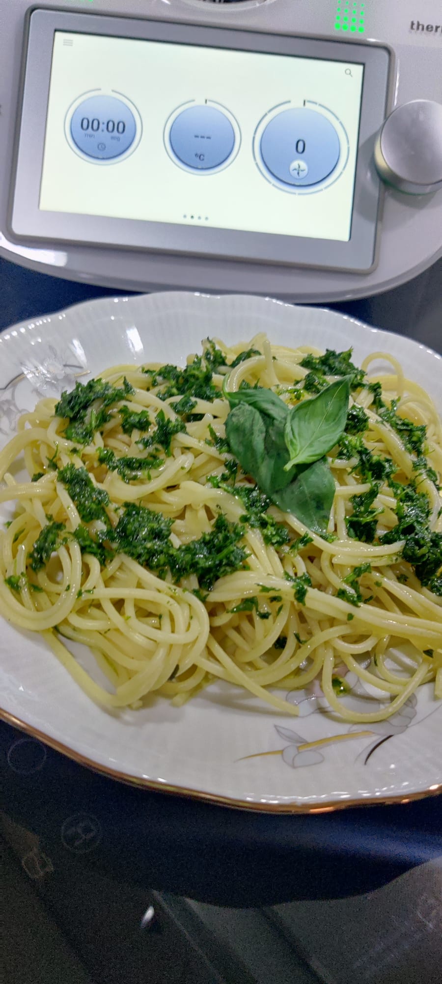 En casa siempre tengo albahaca, perejil y ajo picado en una bolsita en mi congelador, así a la hora de hacer este plato , es poner en un bol un poco de este troceado en un bol y lo cubro de aceite mientras se descongela , y solo tengo que hacer la cocion de la pasta , y es también una manera de mantener el perejil y la albahaca junto con el ajo a mi disposición.