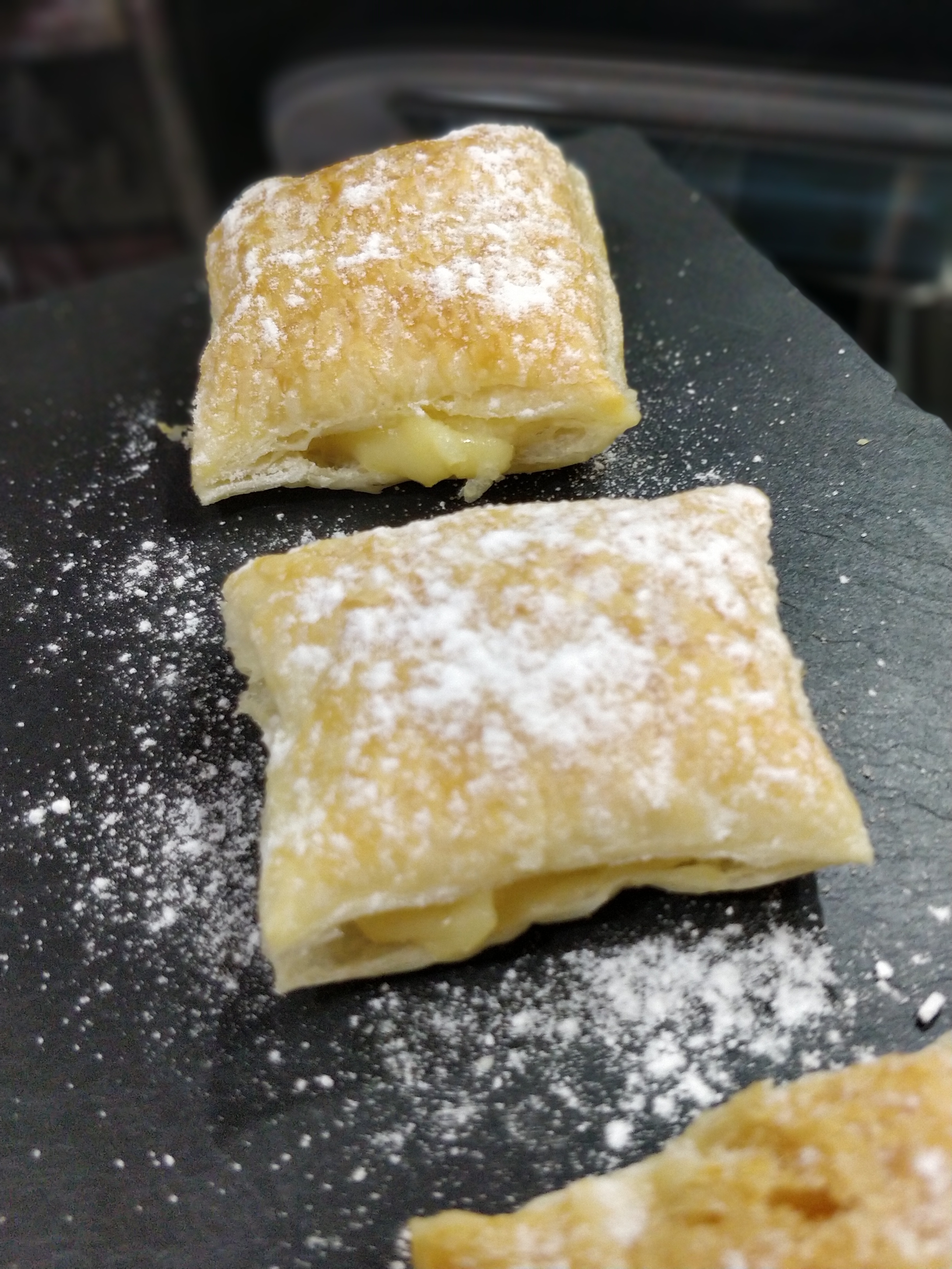 4- Ahora toca rellenar los MIGUELITOS, varias que es muy fácil abrirlos y con una cuchara o manga pastelera rellenar con la crema pastelera ,y espolvorear con azúcar glas antes de servir .
