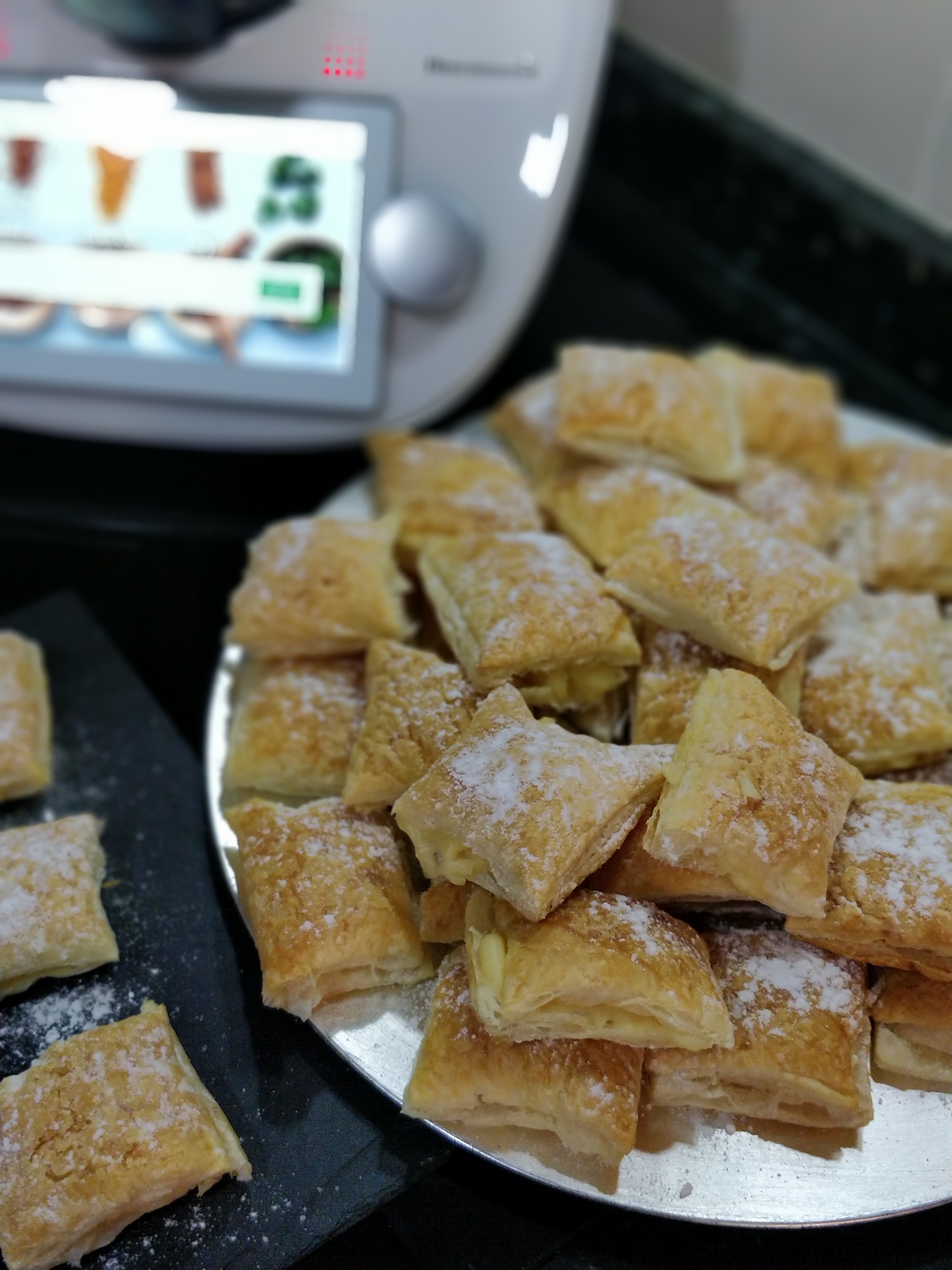 3- Mientras se hace la crema cortar la plancha de hojaldre en 24 cuadrados y sin pinchar ni nada ,hornear unos minutos hasta que se hinche y dore . Sacar del horno y volver a hornear la siguiente plancha.