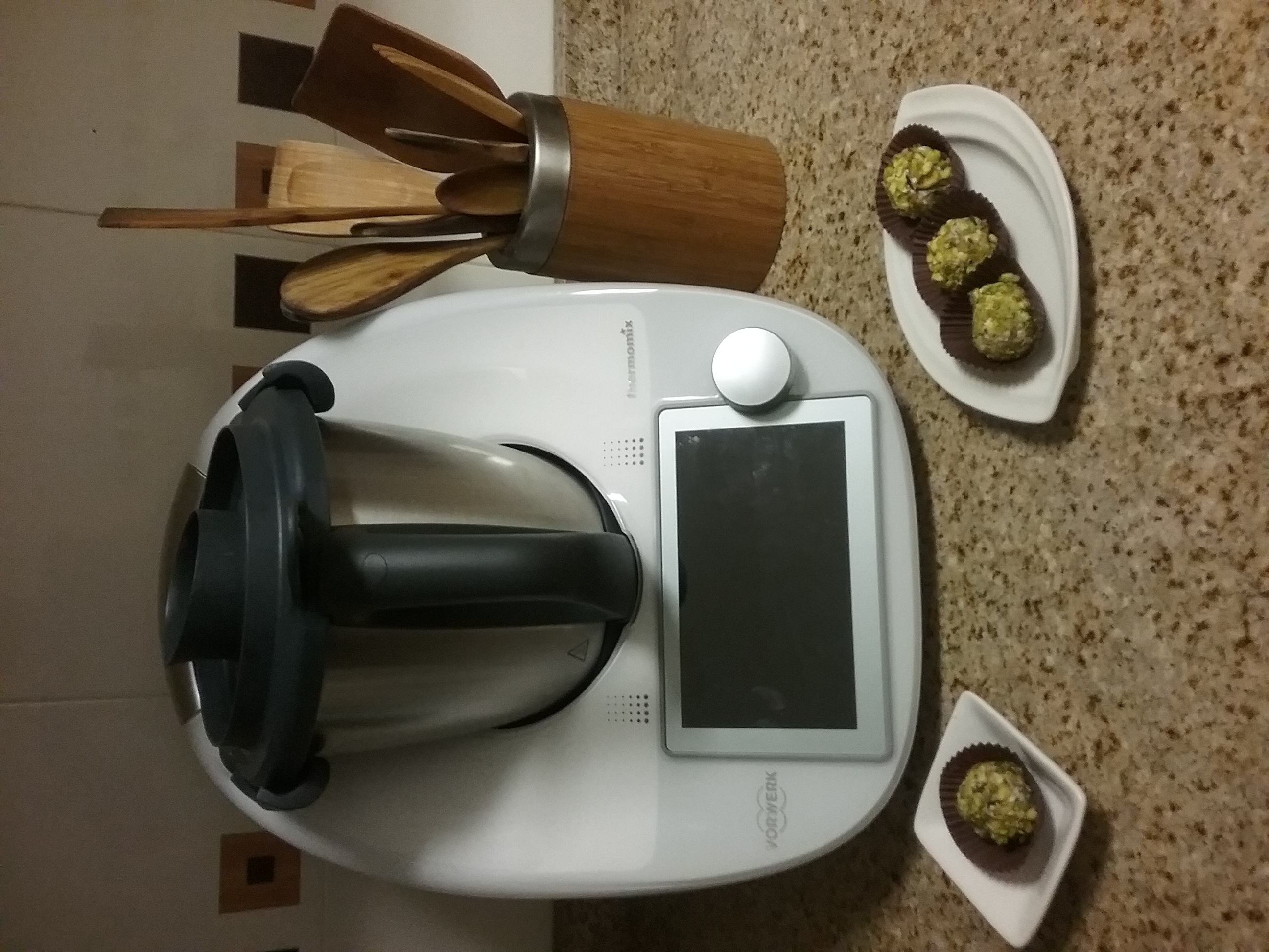3. Añadimos el resto de los ingredientes y mezclamos 10 segundos/ velocidad 4. Forme bolas de 20 g más o menos y rebocelas con los pistachos reservados coloquiales en cápsulas de papel y reservamos en el frigorífico en una bandeja una hora y media antes de servirlas.