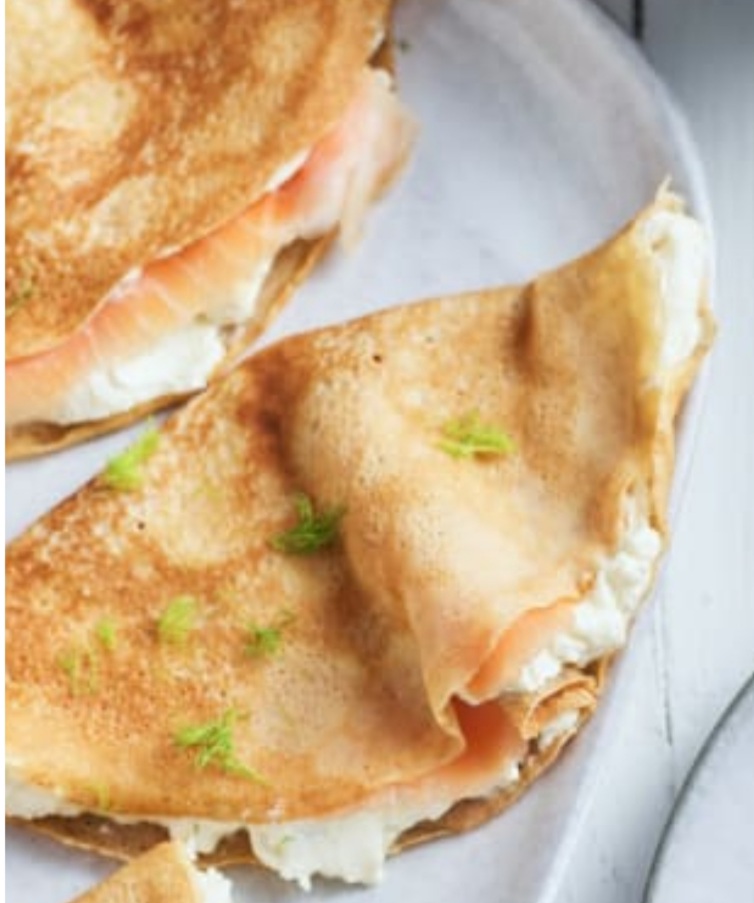 Unte cada crêpe con la mezcla de queso, ponga una loncha de salmón encima y doble por la mitad. Sirva templadas o frías.