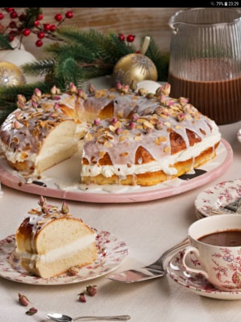 Ponga en el vaso la clara, 10 g de agua de rosas y 180 g de azúcar glas. Mezcle 10 seg/vel 6. Vierta sobre el roscón, espolvoree con las almendras y decore con las rosas secas.