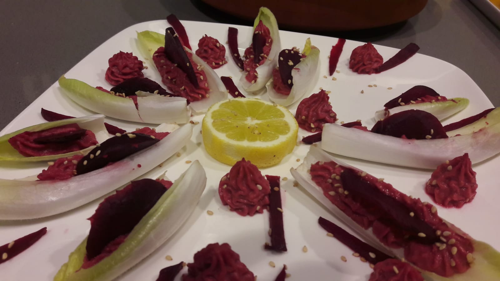 2.- Ponga en cada hoja de endibia 1 lámina de remolacha, 1 cucharada de hummus y otra lámina de remolacha enrollada cono un cono. Riegue con el aceite y espolvoree con la pimienta y el sésamo tostado. Sirva inmediatamente