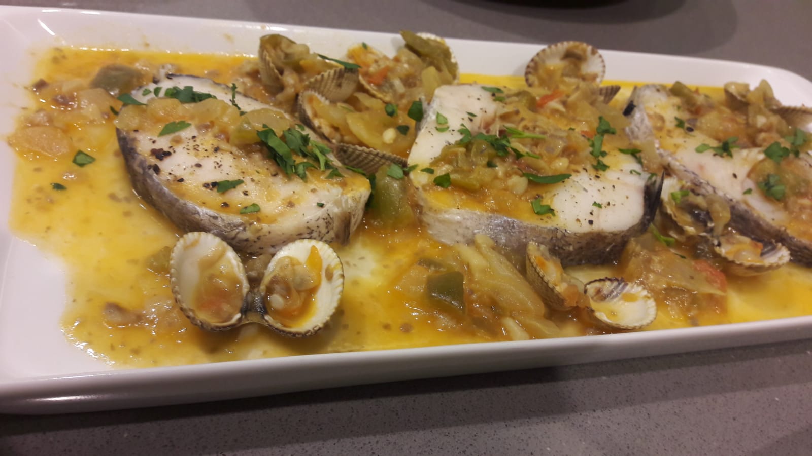 MERLUZA AL VAPOR CON ALMEJAS Y SALSA DE VERDURAS