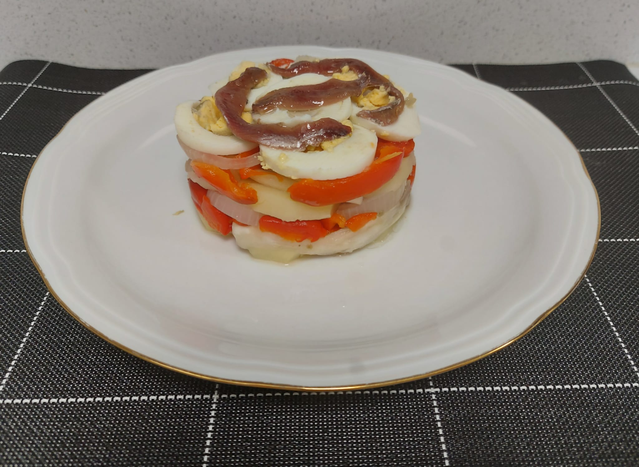 Espolvoree las patatas con sal y, con ayuda de un aro de emplatar (Ø 8-10 cm), vaya colocando capas de patata, pimiento, berenjena y cebolla. Termine con rodajas de huevo duro y 1-2 filetes de anchoa. Riegue con el líquido de las verduras y el aceite restante y sirva.