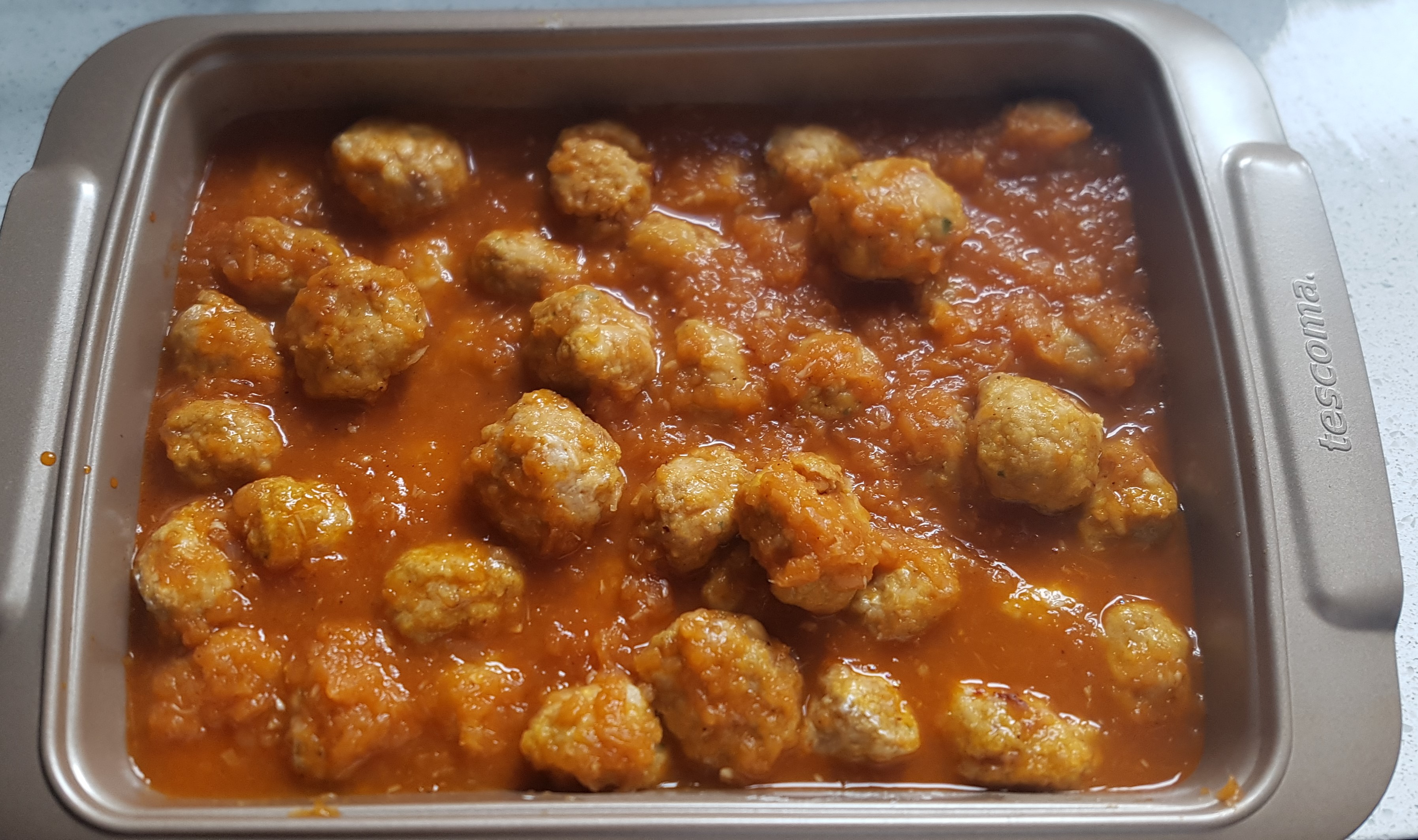 Vierta en la fuente sobre las albóndigas y hornee durante 10 minutos (180°C) . Sirva inmediatamente espolvoreadas con perejil.
