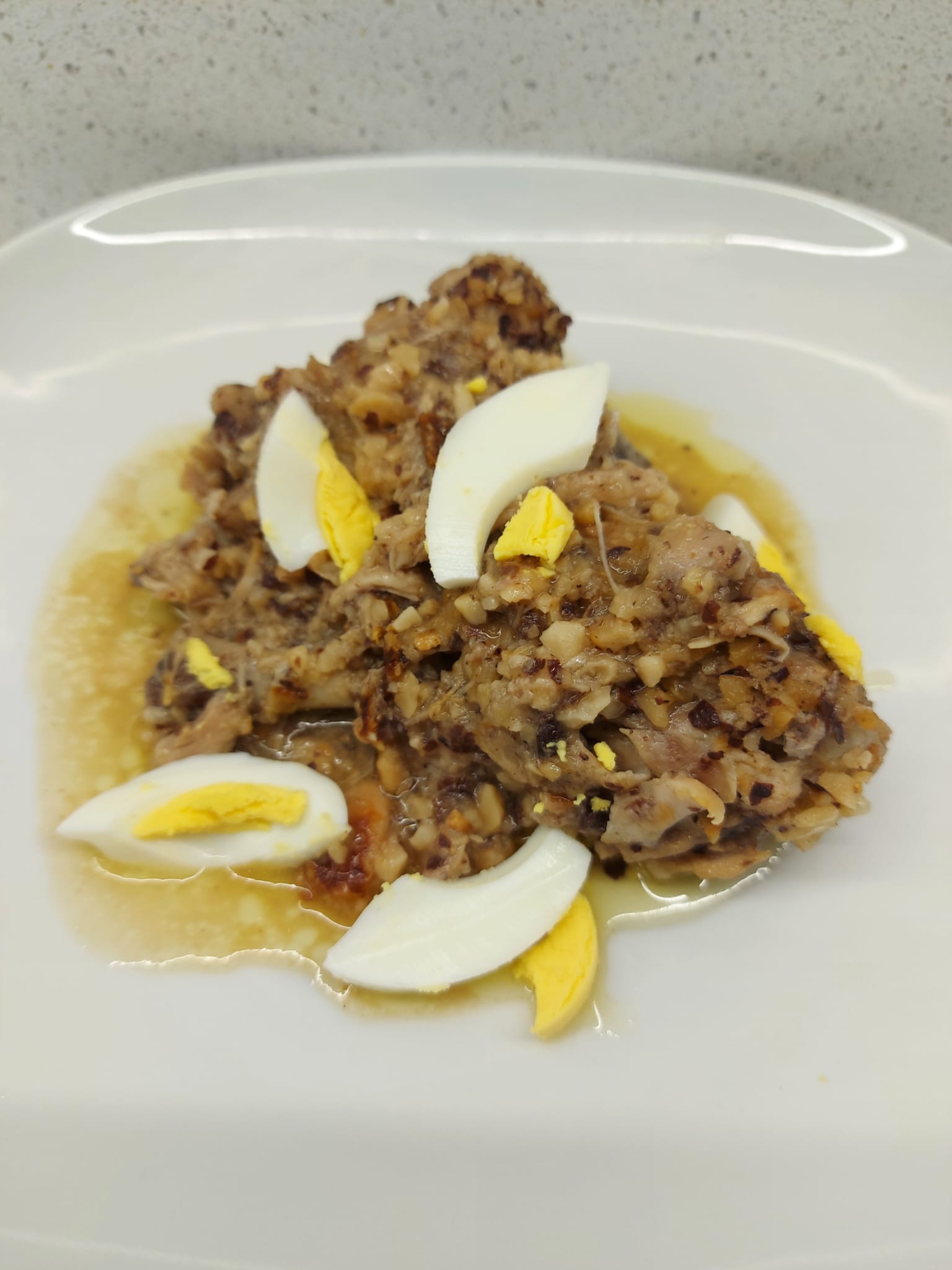 Vierta el pollo en un recipiente y sirva espolvoreado con los huevos picados reservados.