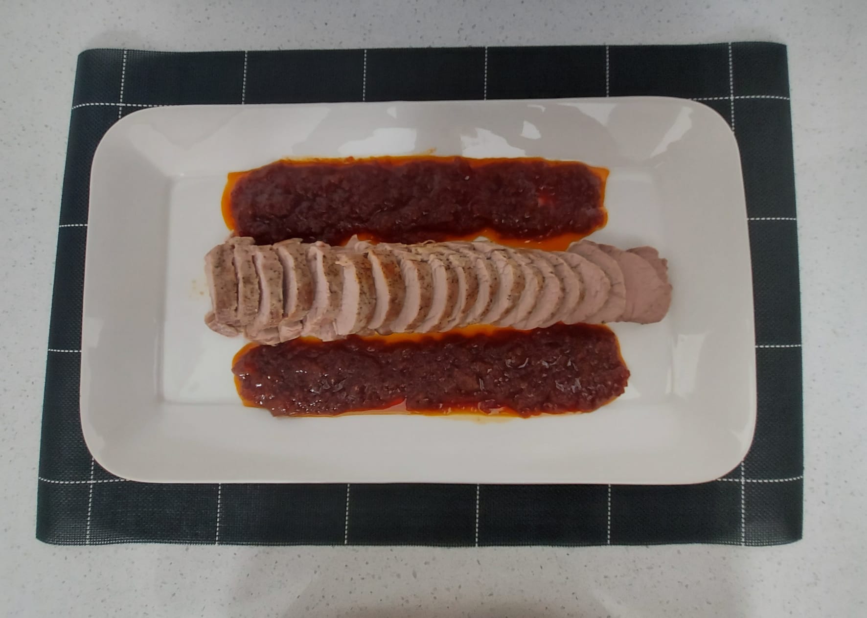 Añada al vaso la sobrasada y la miel programe 8 min / 100ºC / giro izda / vel 1. Mientras tanto , corte los solomillos en rodajas ( aprox. 5 mm ) y colóquelas en una fuente. Retire la salsa del vaso y sirva junto con los solomillos.
