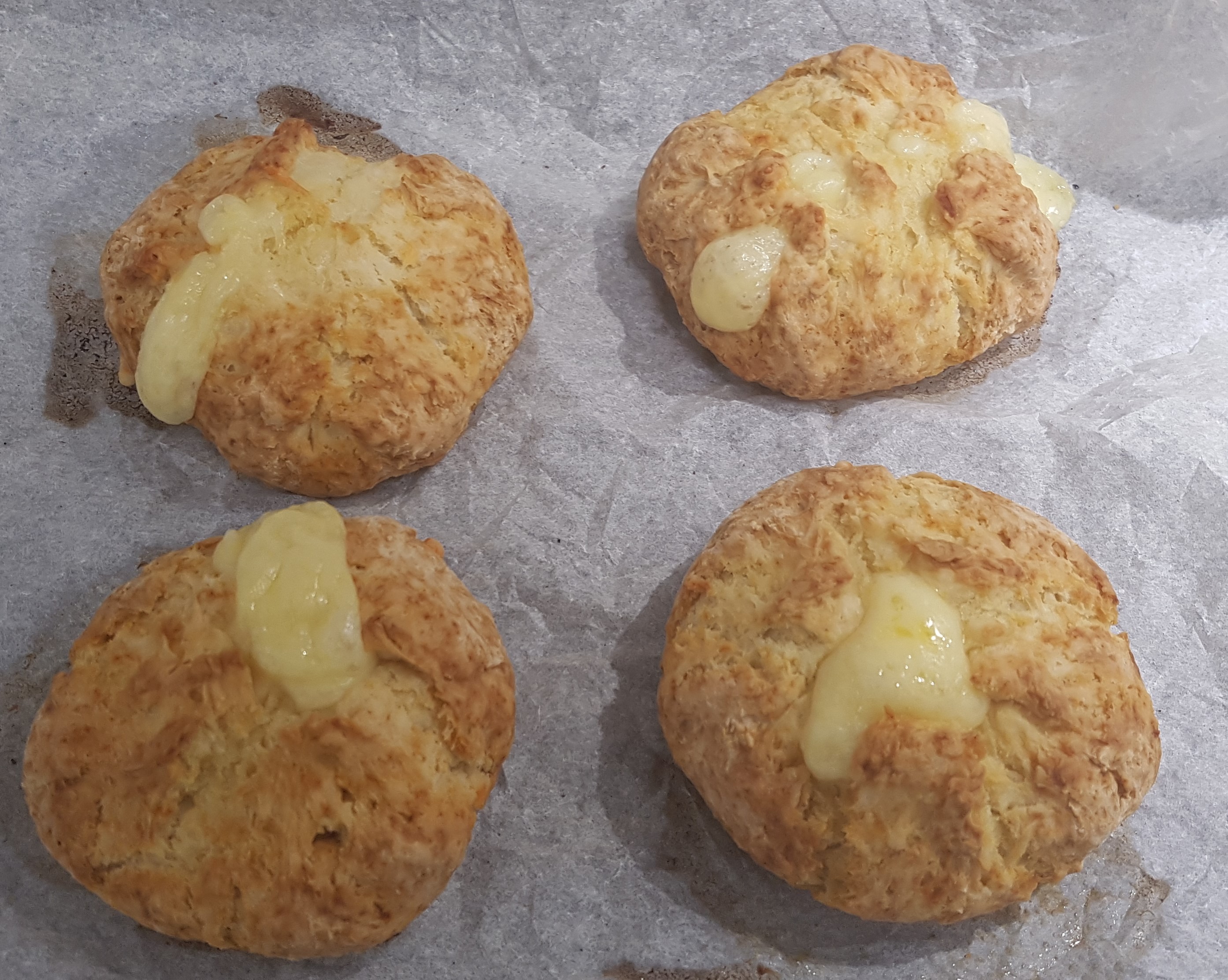 Sobre una superficie espolvoreada con harina, extienda cada bola hasta obtener un círculo de aprox, 0 15 cm y coloque en el centro 2 cucharadas del queso rallado reservado. Cierre los bordes hacia el centro cubriendo el queso, presione suavemente con las yemas de los dedos y aplane cada pan ligeramente. Colóquelos en la bandeja preparada y ponga encima de cada pan 1/2 cucharadita de mantequilla.