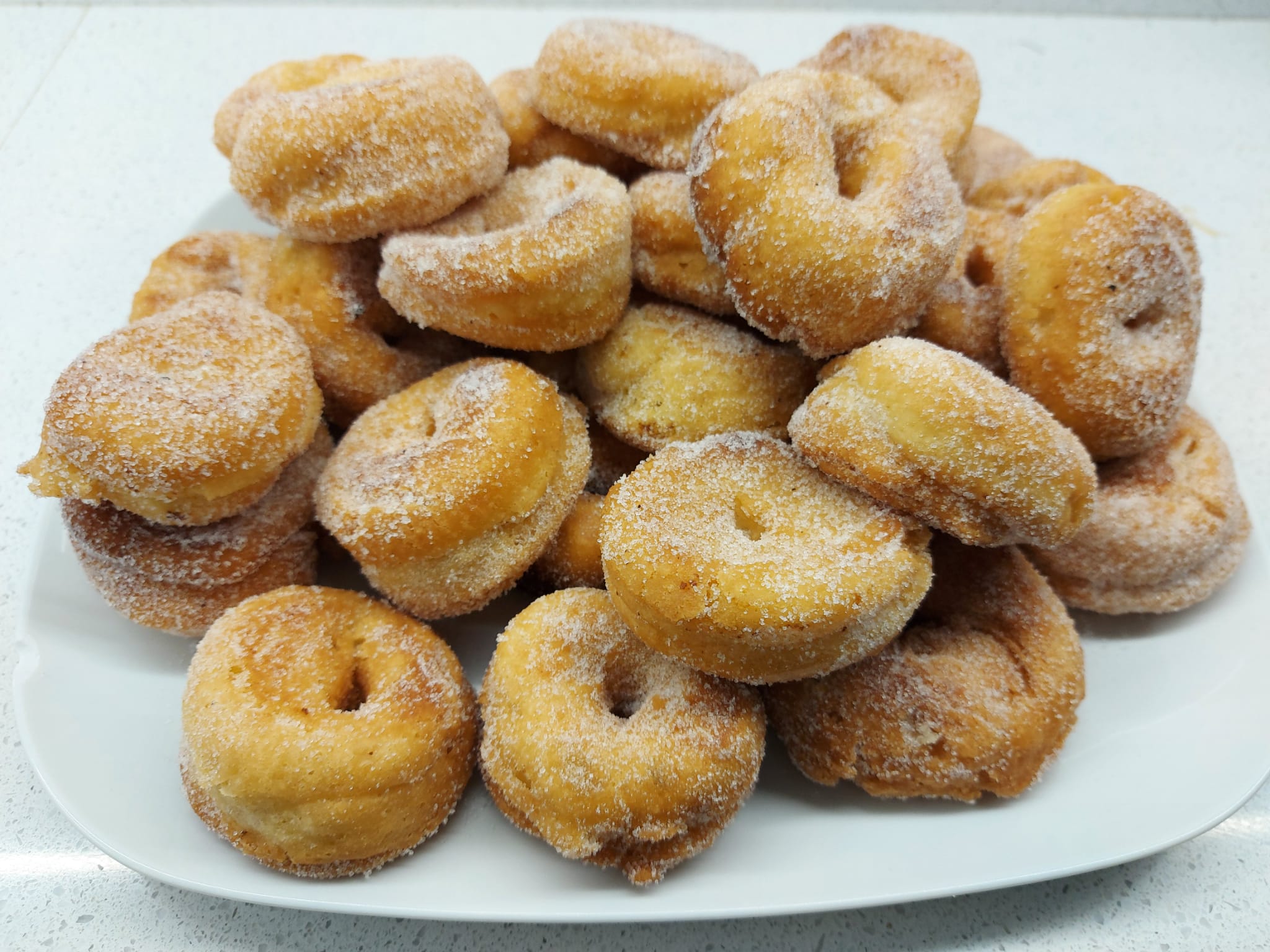 Caliente el aceite a fuego medio en una sartén honda para freír. Con las manos untadas en aceite, forme bolas (10-12 g) del tamaño de una nuez. Únalas de dos en dos y presione en el centro con el dedo para formar las rosquillas abriéndolas un poco. Vaya friéndolas en el aceite caliente. Escúrralas sobre papel de cocina y rebócelas en el azúcar. Deje enfriar y sirva o conserve en un recipiente hermético.