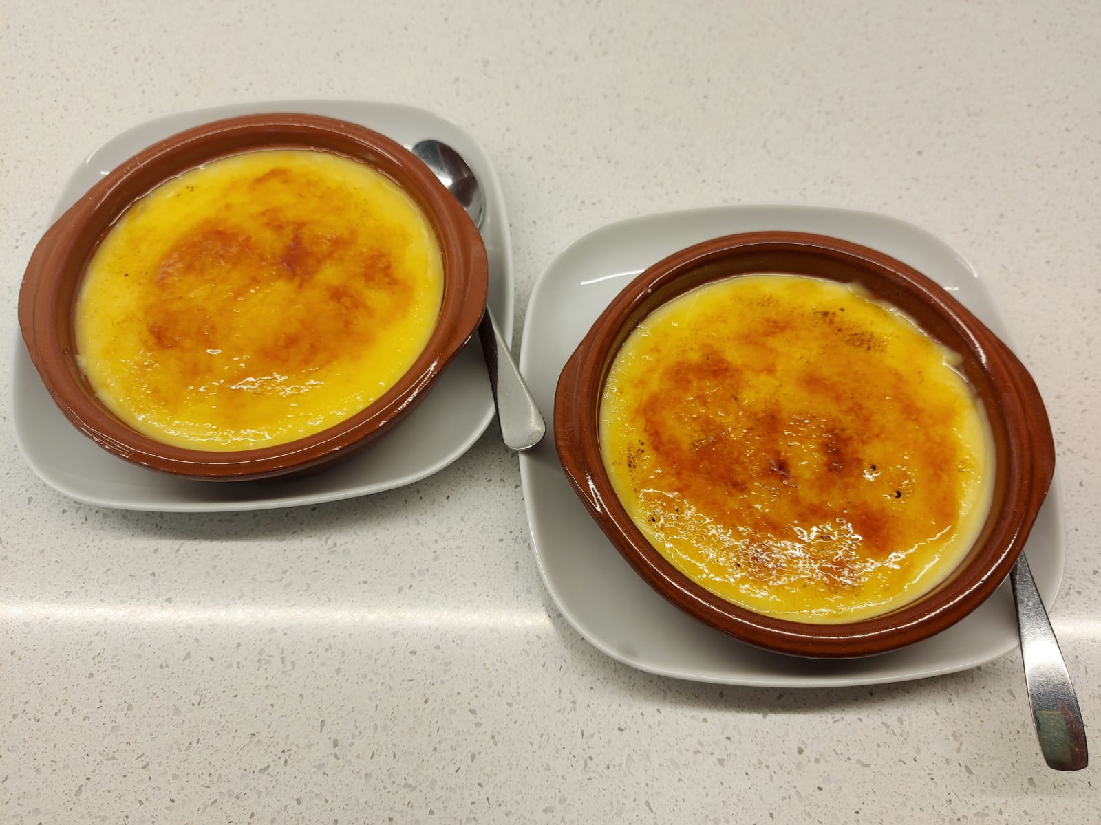 Retire la mariposa, la piel de limón y el palo de canela y mezcle 10 seg/vel 7. Vierta en 6 cazuelitas de barro y deje templar durante al menos 20 minutos. Espolvoree con 100 g de azúcar y queme con un soplete, un quemador especial o gratine en el horno unos minutos hasta que el azúcar se convierta en caramelo. Sirva templada o fría.