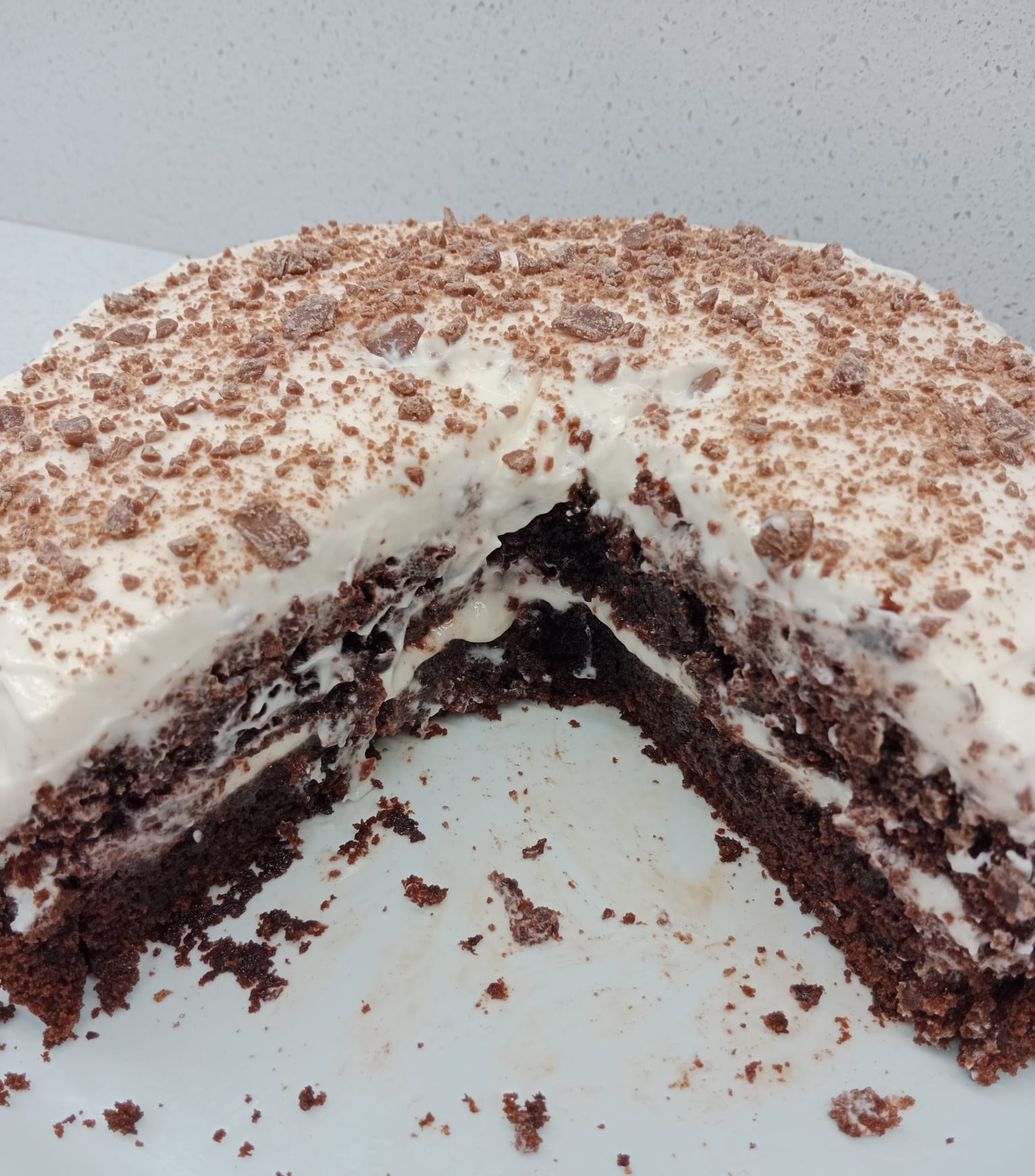 Esta tarta está mejor de un día para otro y la receta original, la crema de cobertura, la lleva sólo por arriba, pero yo una vez enfriado el bizcocho, lo corté por la mitad y puse la mitad de cobertura por el medio y la otra mitad por encima tal como se ve en la foto y adorné con unas virutas de chocolate.