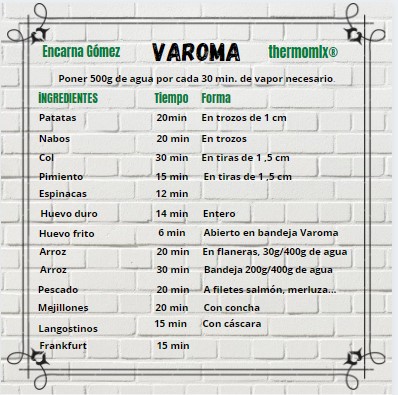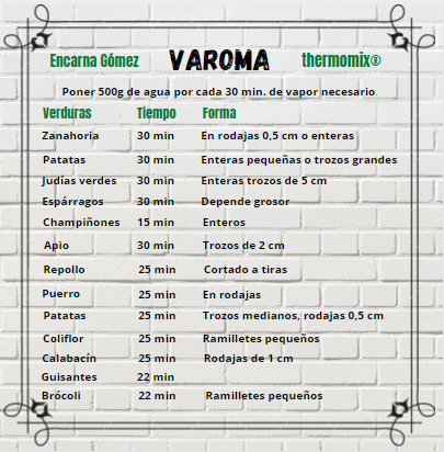 En el libro que viene con Thermomix, dispones de las tablas completas de los tiempos de cocción para cada alimento, ten en cuenta, que si pones exceso de cocción, se pierden buenas propiedades de los alimentos.