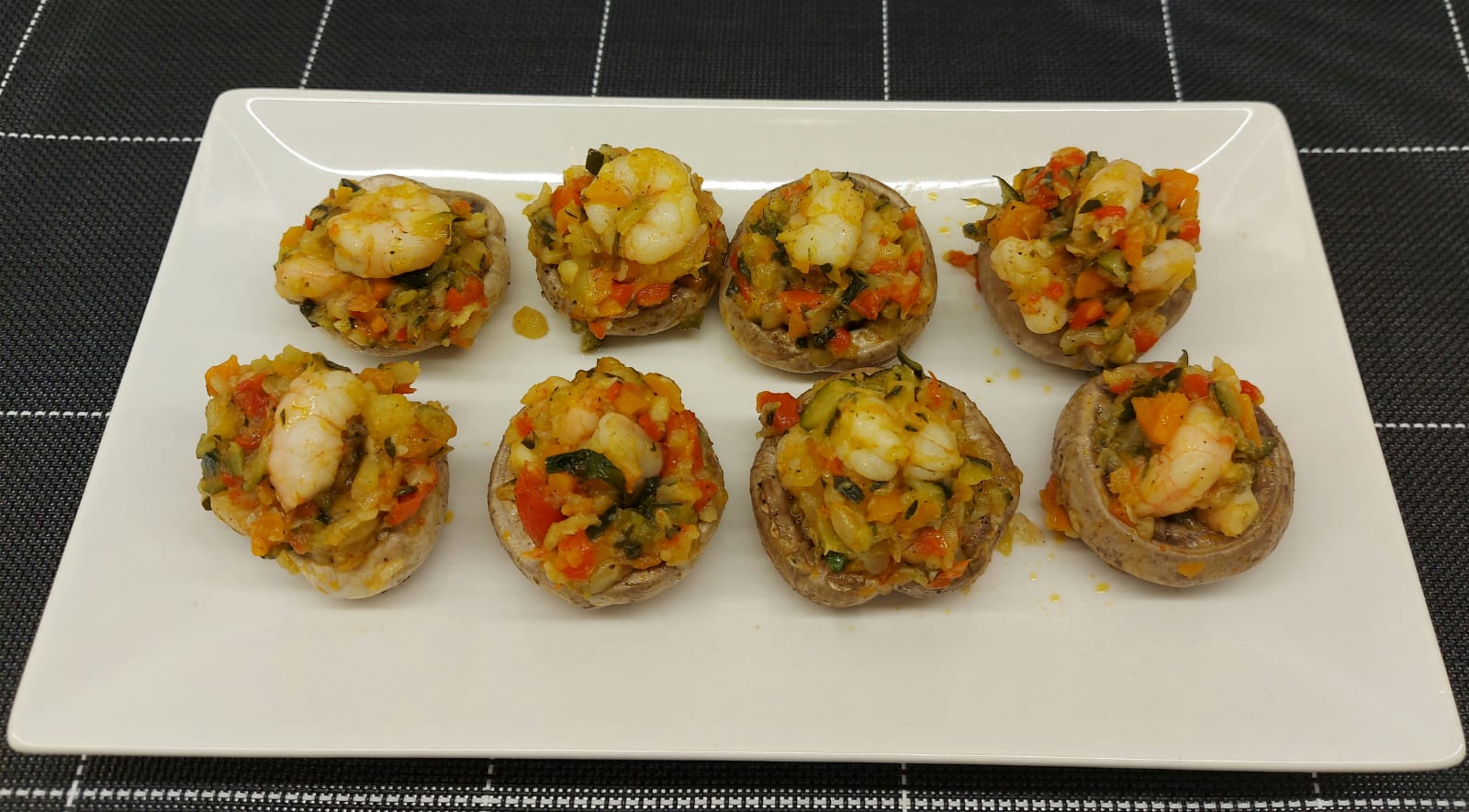 CHAMPIÑONES RELLENOS DE VERDURA Y GAMBAS
