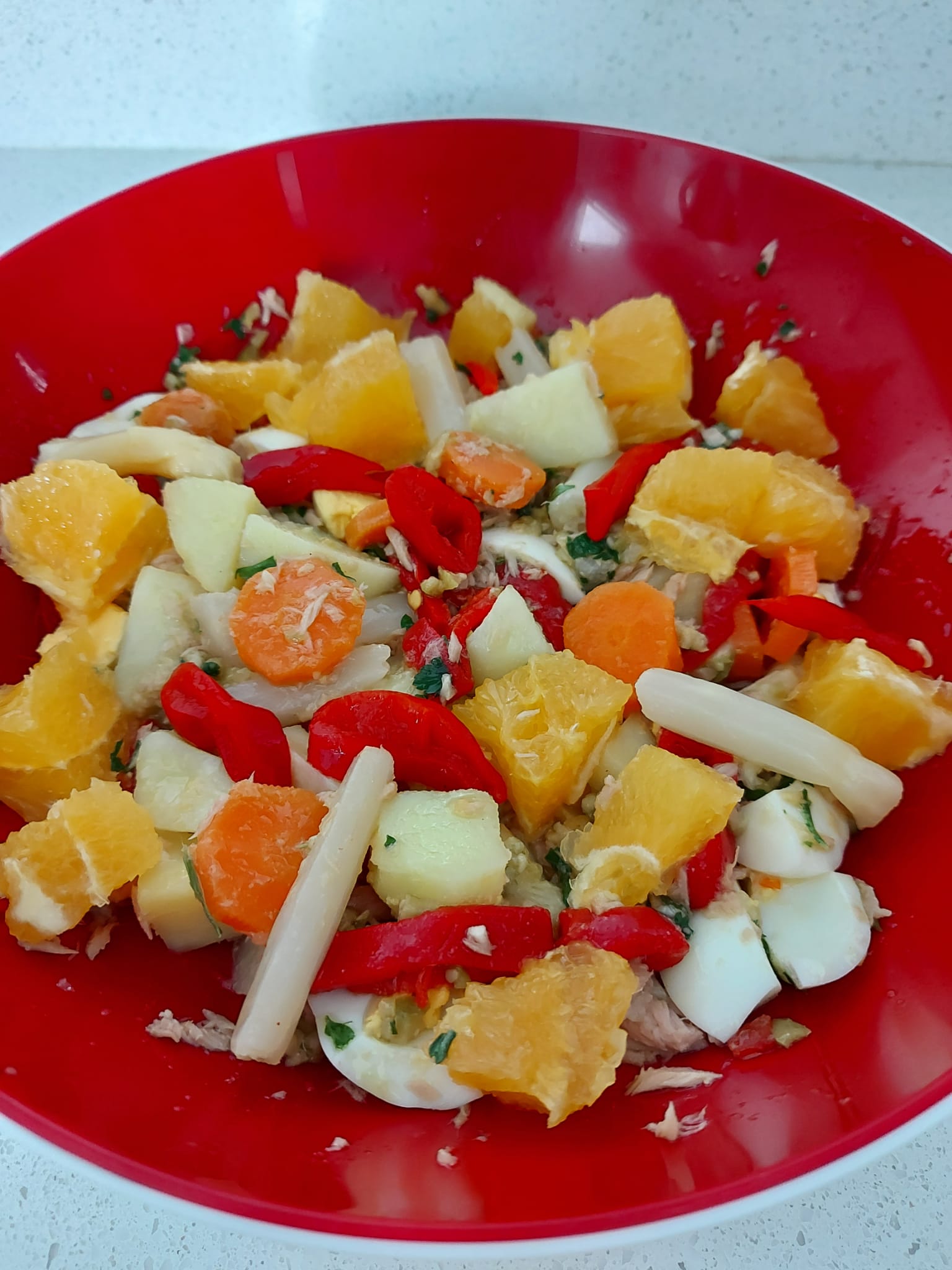 Añada el pimiento verde, las aceitunas, el aceite, el vinagre y la sal. Trocee 3 seg/vel 5. Vierta la vinagreta en la ensaladera y añada el atún, las yemas de espárragos, la naranja, el pimiento y los huevos cocidos cortados en trozos. Mezcle con la espátula y reserve en el frigorífico (aprox. 30 minutos) hasta el momento de servir.