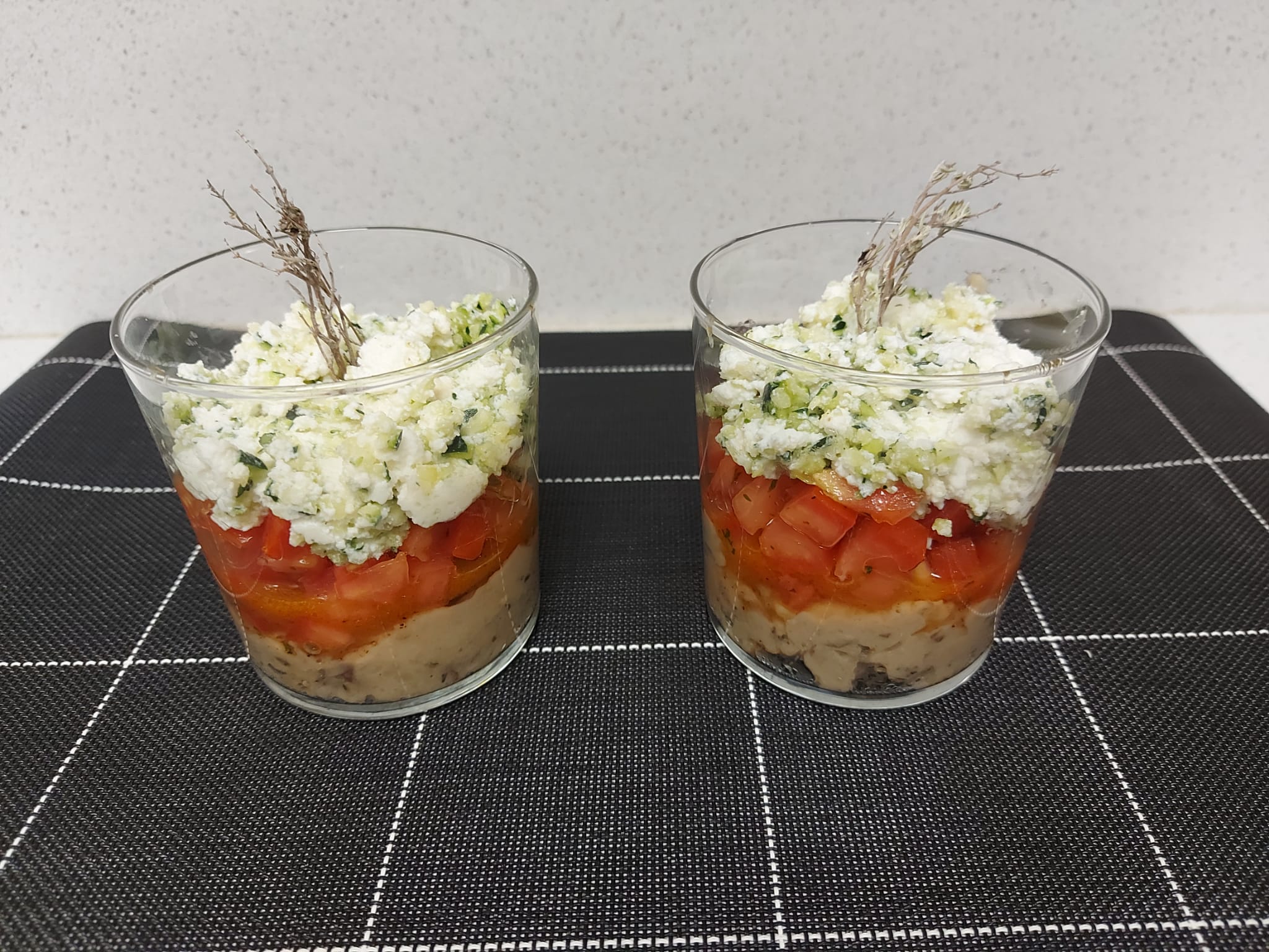 Ponga en un bol el requesón y el calabacín escurridos, espolvoree con la pimienta y mezcle. Reparta en los tarros sobre el tomate y decore con flores de tomillo. Reserve en el frigorífico hasta el momento de servir.