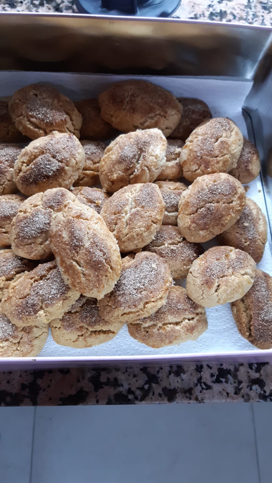 - En una bandeja forrada con papel de horno ir poniendo los mantecados que haremos formando bolitas no demasiado grandes (los podemos hacer redondos u ovalados), y al hacer la bolita no apretar demasiado. Colocarlos en la bandeja y pintarlos con la clara de huevo y ponerle un pellizco de la mezcla de azúcar y canela por encima de cada mantecado.