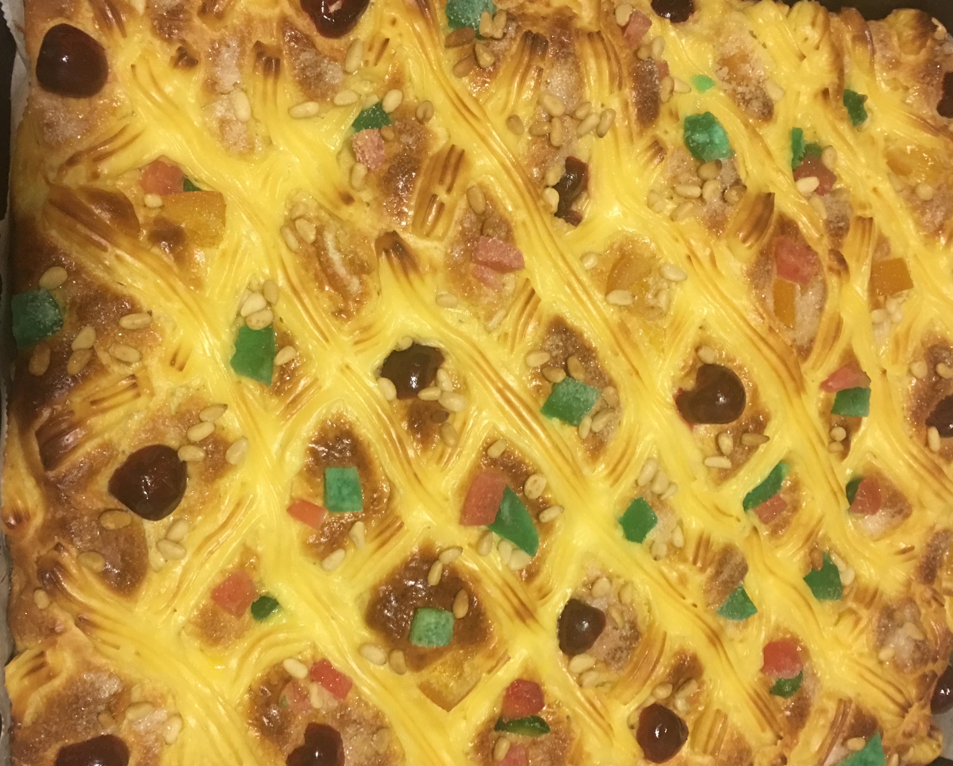 Decoramos con las guindas,y la fruta escarchada.Echamos piñones por encima y dejamos que repose 20 min. a temperatura ambiente y en un lugar sin corrientes.
