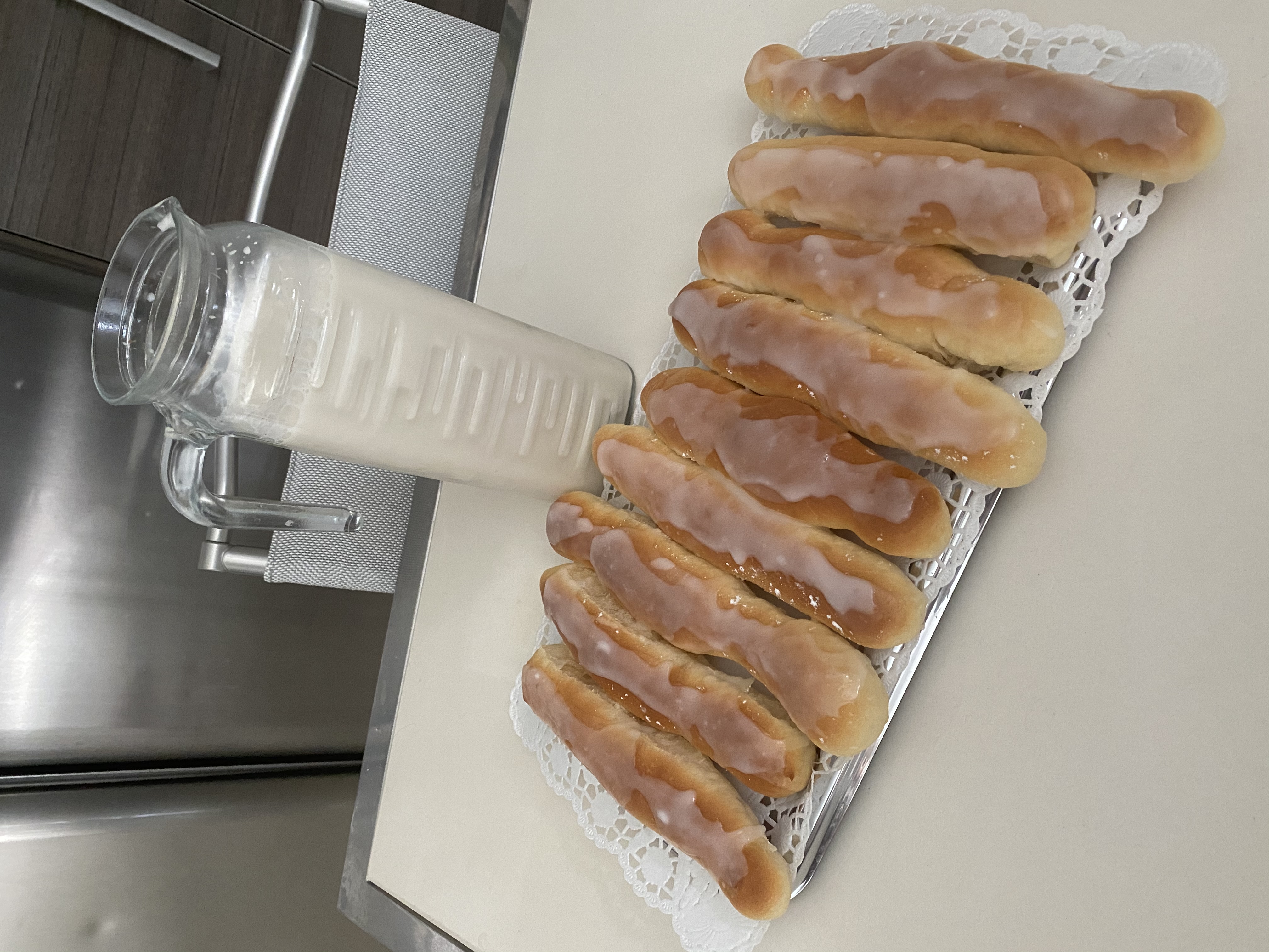 3.Sacar la masa del vaso y dividir en porciones de unos 25 gr. Hacer bastones e ir colocándolos en una bandeja de horno en la que previamente hemos colocado papel de hornear. Dejar un espacio de unos 2 cm. entre uno y otro, porque luego crecerán.Dejar reposar 2 horas o hasta que doblen su volumen (depende de la temperatura ambiente).