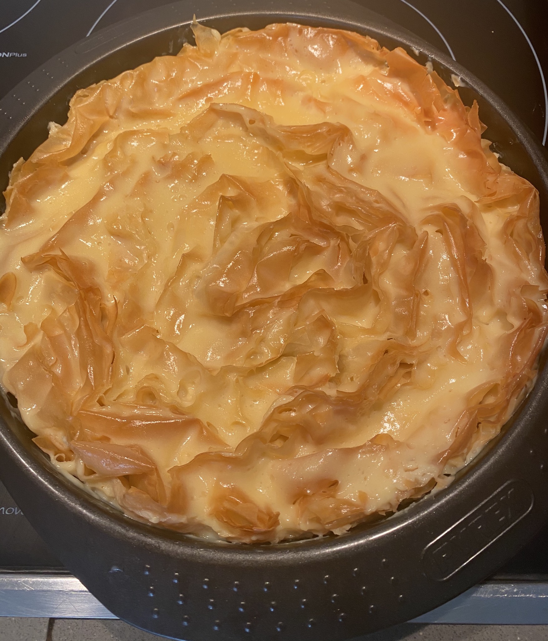 5•Cuando la masa filo esté medio dorada, retirar el molde del horno y repartir sobre él la crema.