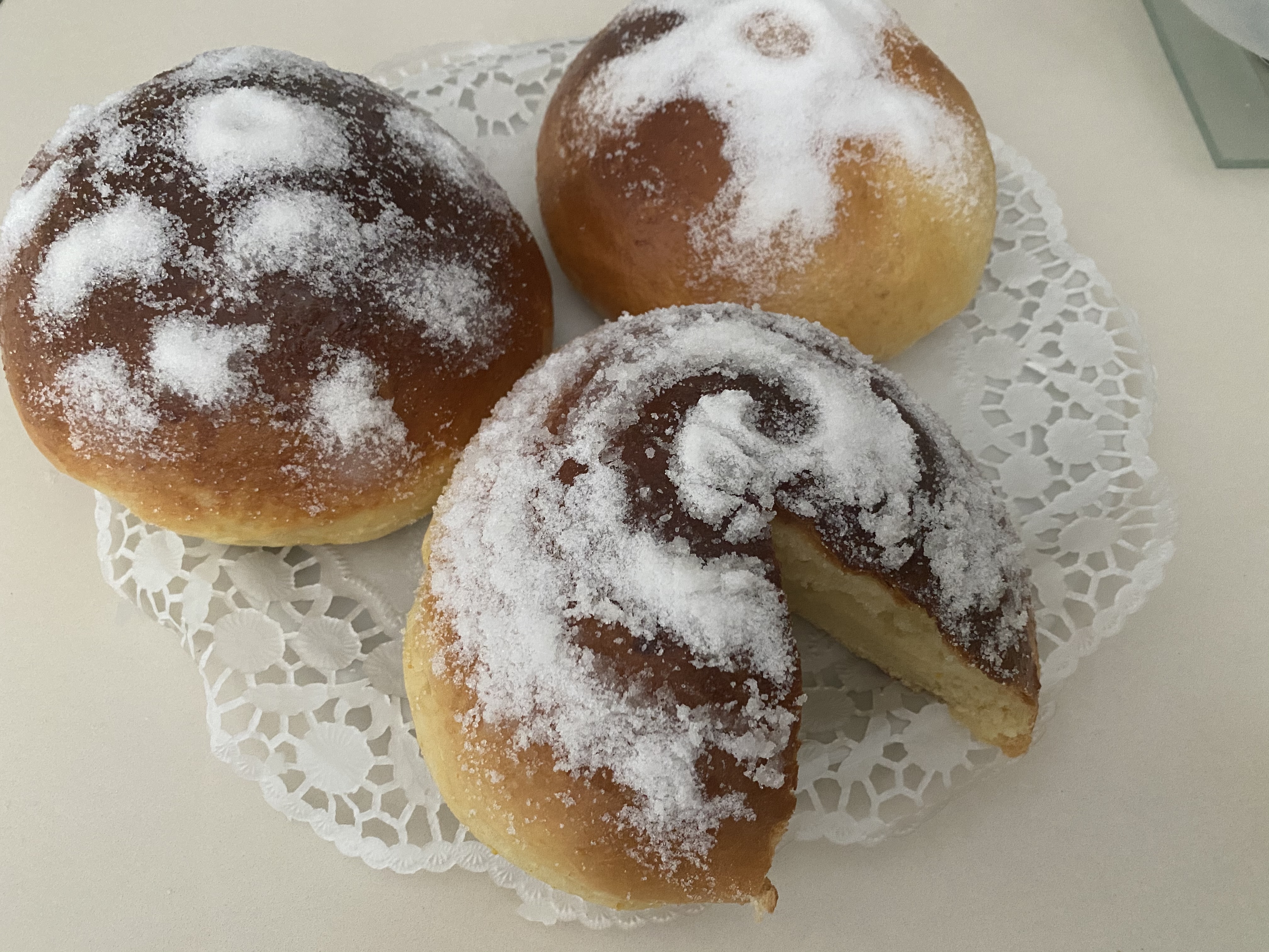 6•Con la masa formar una bola y dividirla en tantas toñas como se quiera ,en este caso 3.Colocar en la bandeja de horno preparada.Pintar con huevo y espolvorear con azúcar haciendo un dibujo en espiral o como más guste.