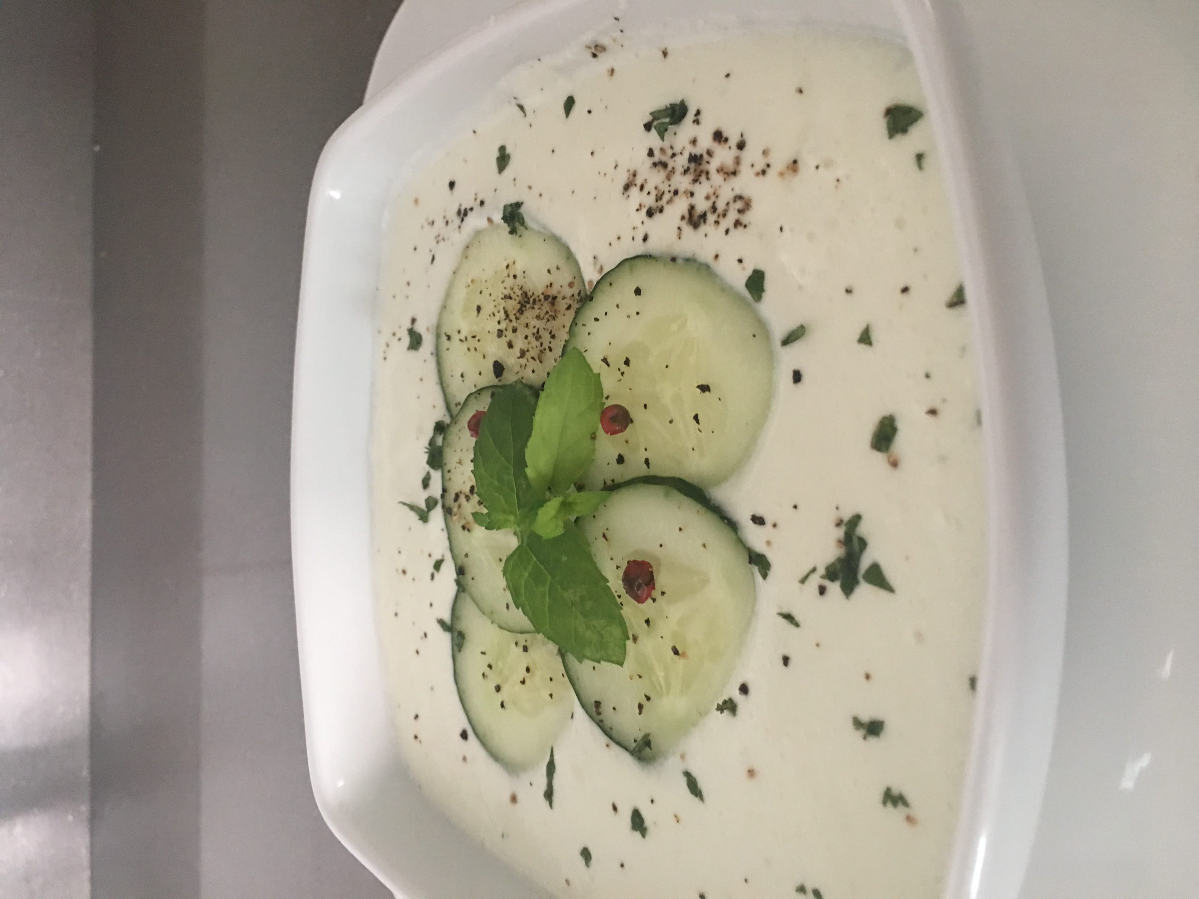 - poner en el vaso con los yogures, el ajo pelado,el vinagre y las ramitas de menta.Triturar al 10 hasta obtener una crema muy fina.
