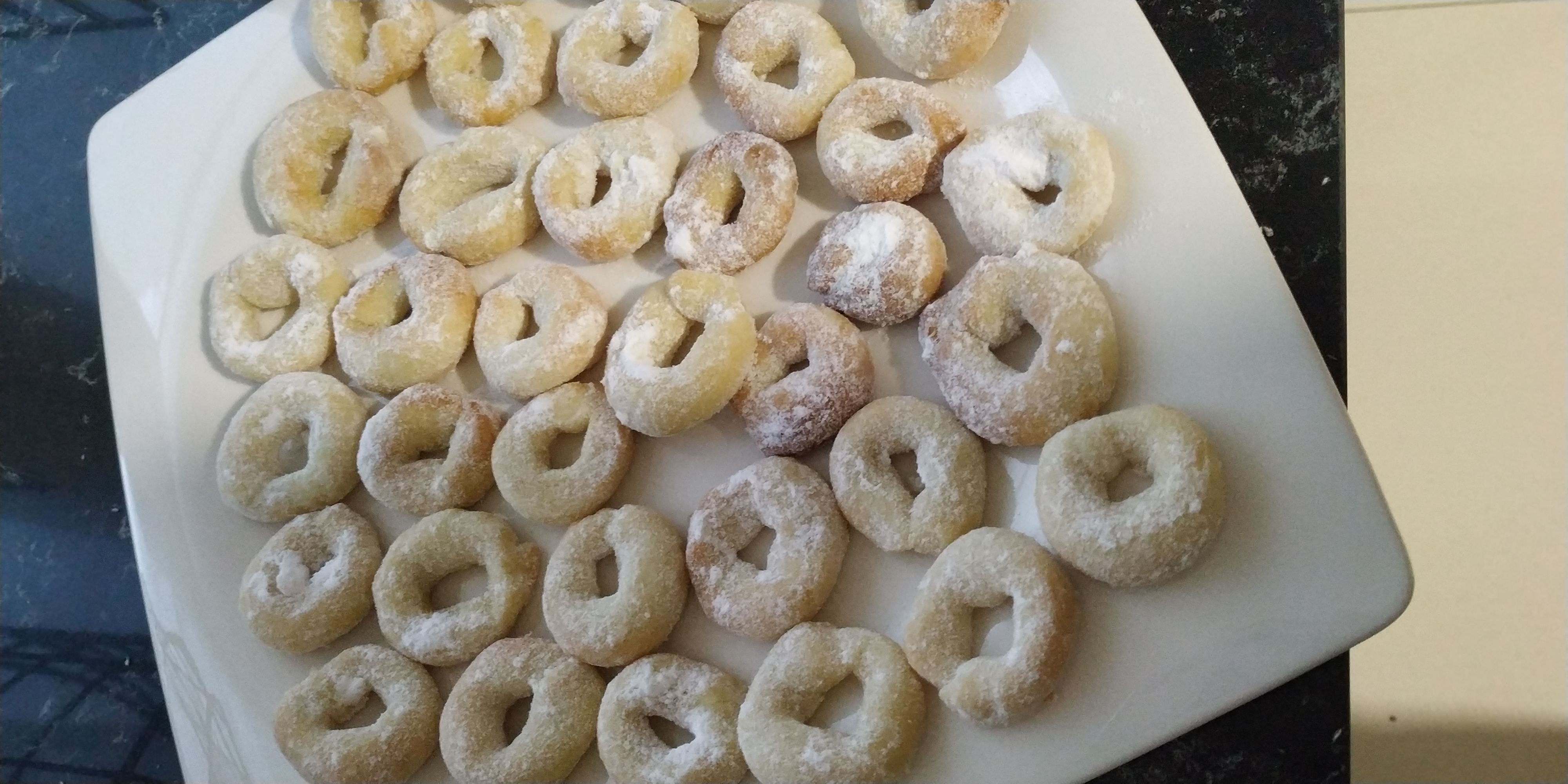 Los ponemos en la bandeja de horno y horneamos de 8 a 10 minutos. Se queda un poco blanquitos, no tienen que coger color de tostado. Ponemos en una bolsa el azúcar glas y vamos empanado los rollitos con esa azúcar.