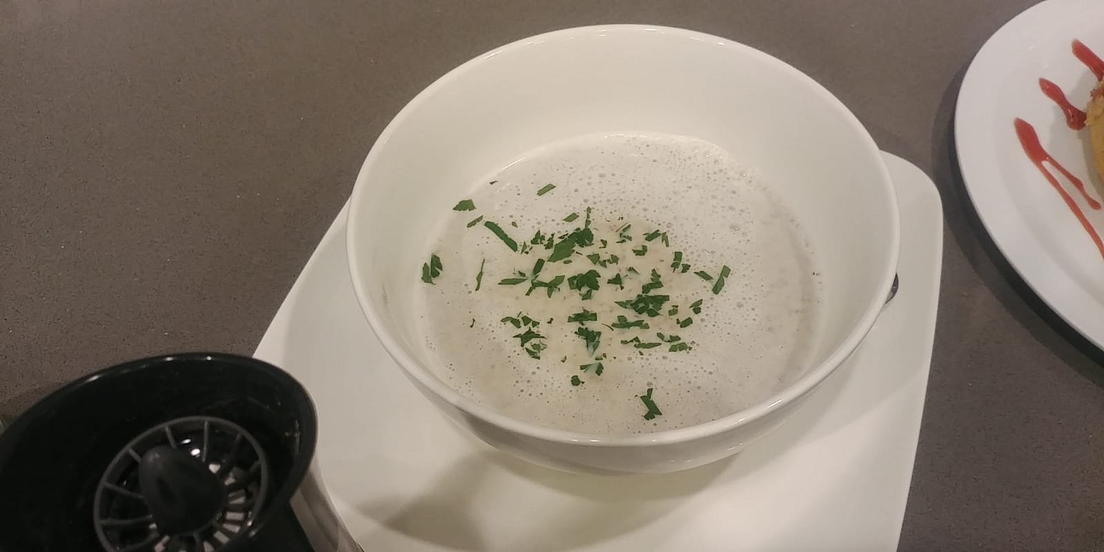 6.-Añada la nata y mezcle 15 segundos en velocidad 6. Sirva la crema de champiñones como primer plato y de segundo, el pescado con la verdura y el arroz.