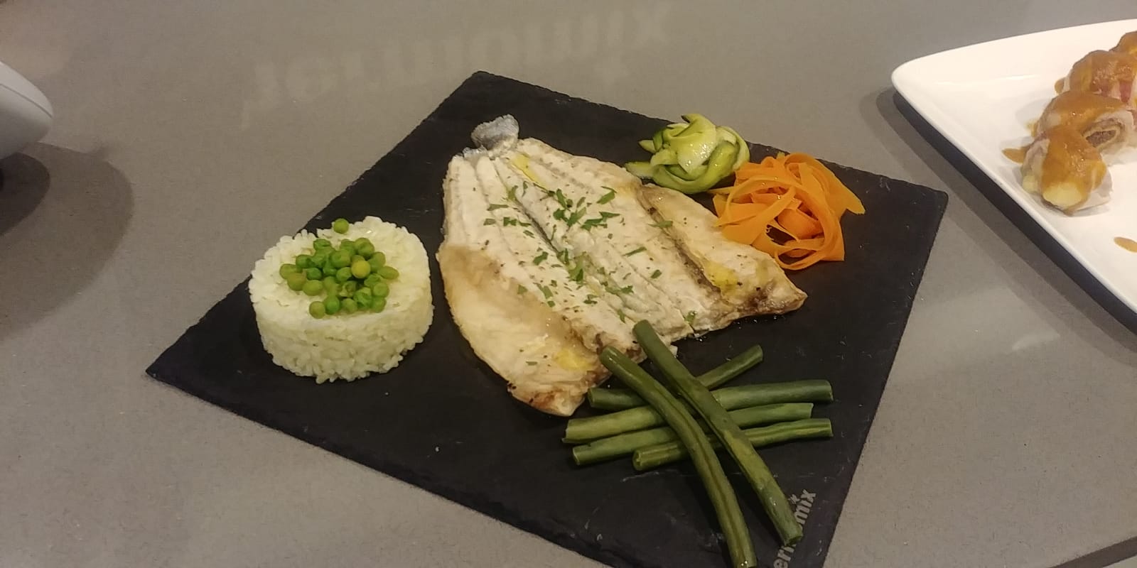 1.-Sitúe el recipiente varoma en su posición y pongas las judías verdes, la zanahoria, el calabacín y los guisantes. Coloque la bandeja varoma con las hojas de col y ponga encima los filetes de pescado. Espolvoree con la sal y la pimienta y riegue con 10 g de aceite. Coloque los champiñones alrededor y riéguelos con el zumo de limón. Tape el varoma y reserve.