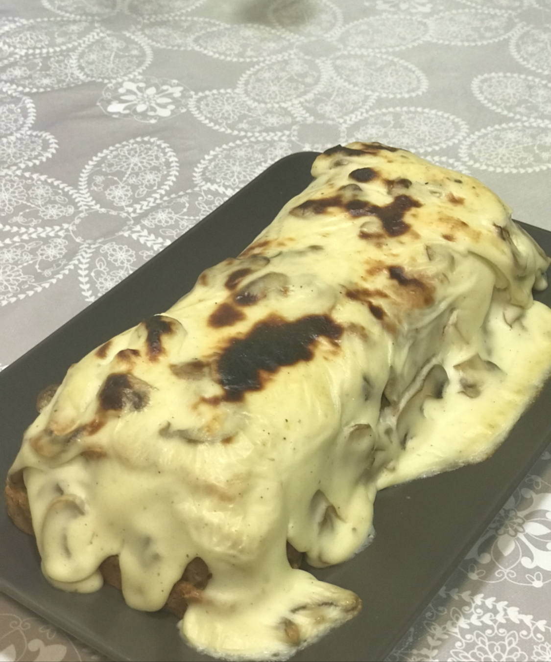 Antes de servir el pastel ,quítele el papel film ,dele la vuelta en una bandeja honda y desmóldelo ,vierta encima la bechamel y esparza el queso por encima.hornee a 200º durante 5 minutos para gratinar la parte de arriba