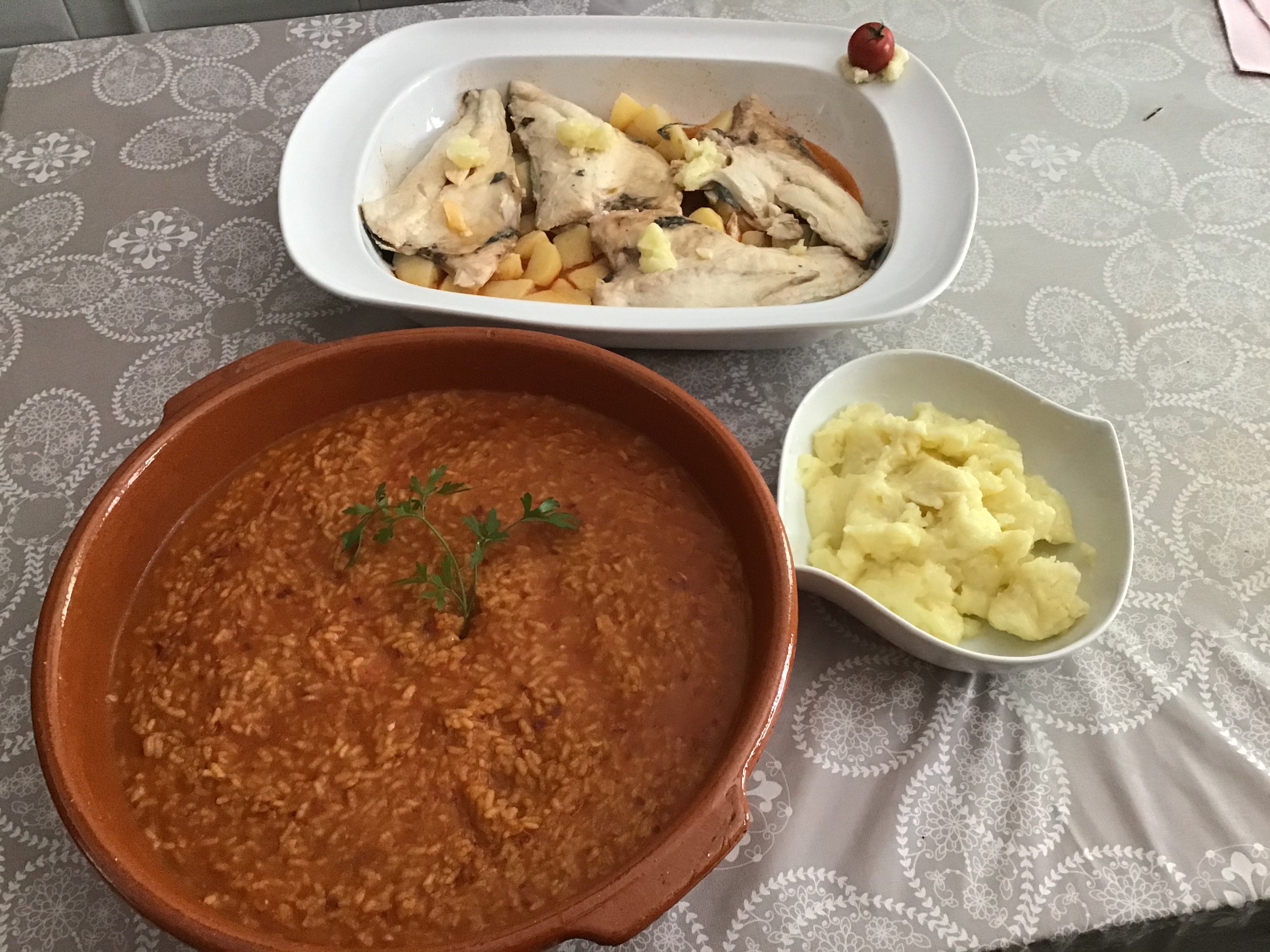 Servir primero el pescado y las patatas regado con el caldo sobrante, y a continuación, servir el arroz con alioli.