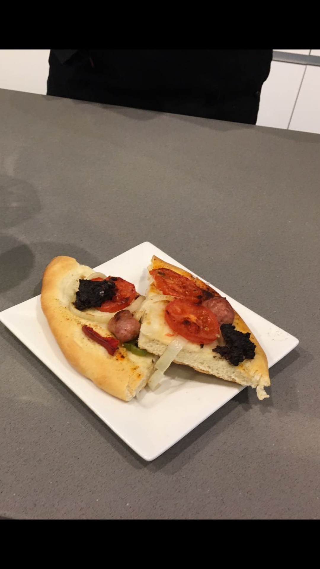 4. Estire la masa y cubra con el tomate, la cebolla, el pimiento en rodajas y la salchicha y morcilla cortada en trozos.