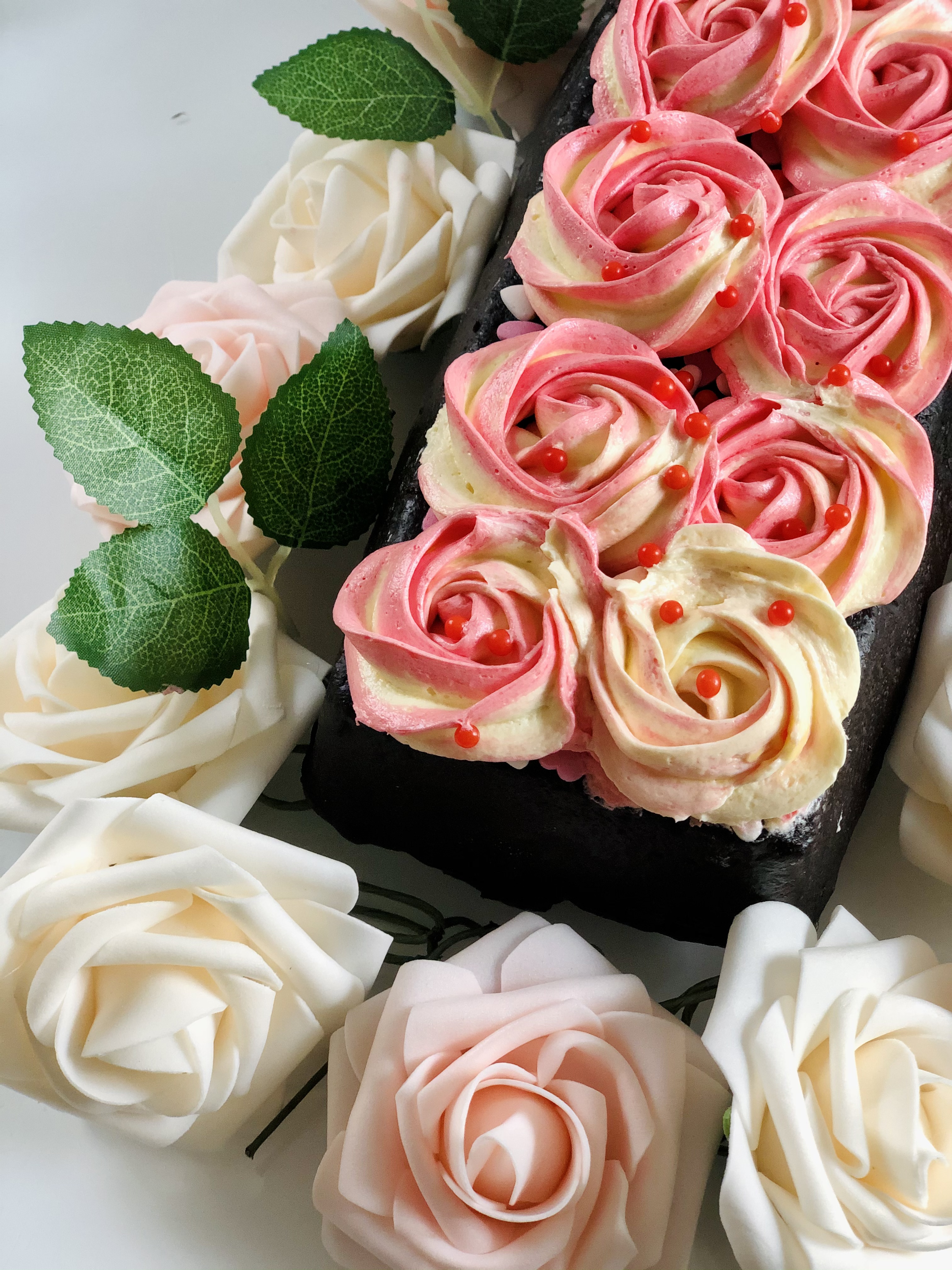 Yo la he versionado con chocolate, y decorándolo con un frosting de queso bicolor.
