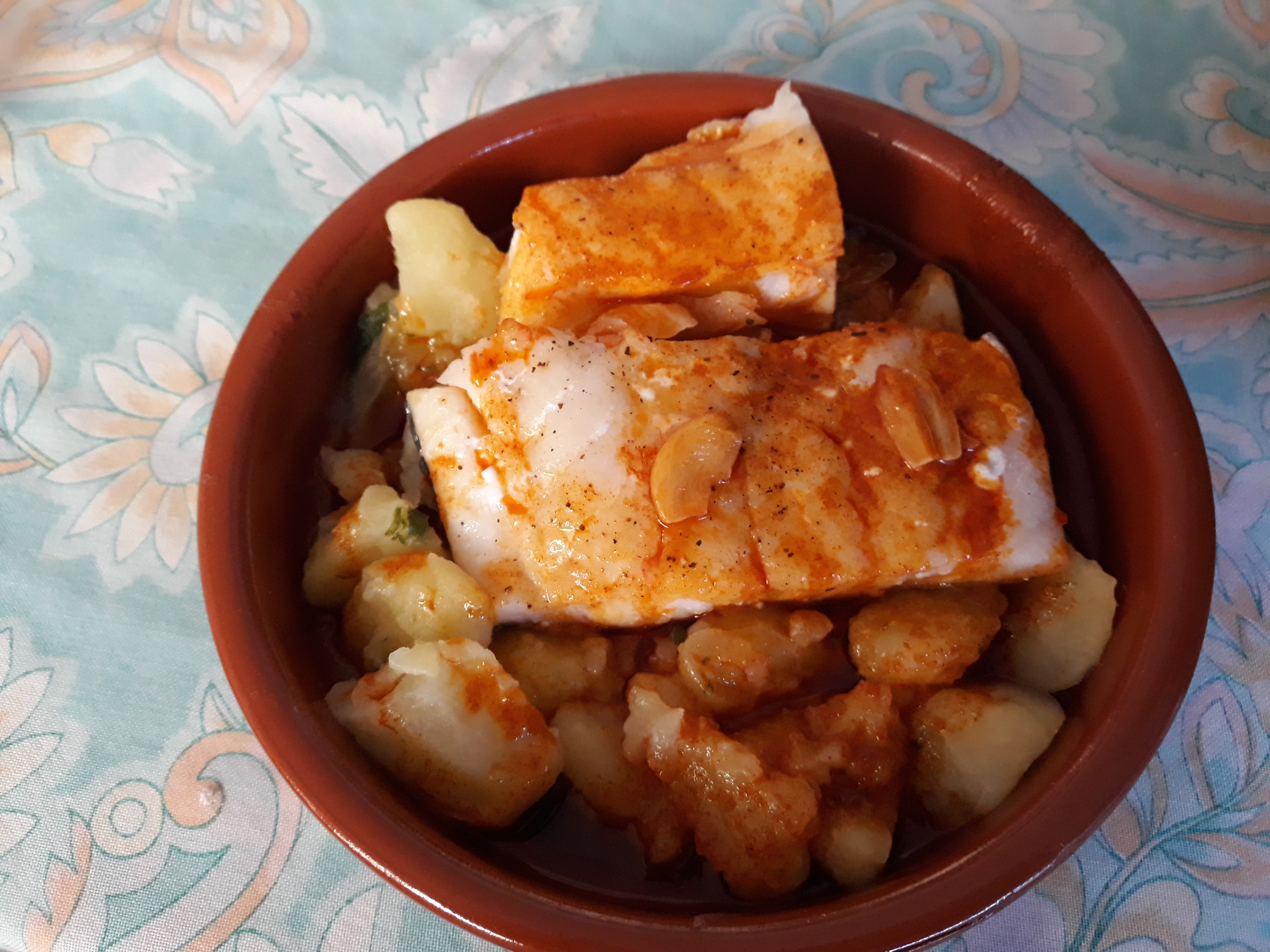 Añada el pimentón alrededor de las cuchillas y mezcle 10seg/ vel 1. Vierta la añada sobre el pescado y las patatas y sirva inmediatamente.