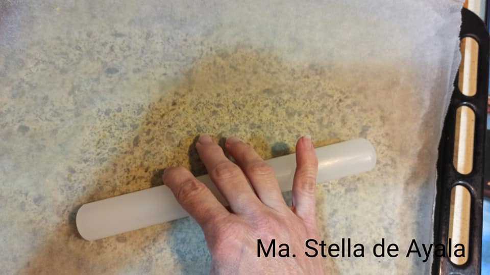 5. Vierte la masa en las bandeJas y extiéndela, primero con la mano y luego ayudándote de un rodillo o algo similar para extender la masa por toda la bandeja dejándola bien fina, aproximadamente 1- 2 mm, ten cuidado de que no te queden huecos, puedes ir pasando de un lado a otro los sobrantes a donde tienes espacios vacíos, este proceso es más fácil si te ayudas de film de plástico o papel de hornear, si no resulta más pringoso pero se puede.