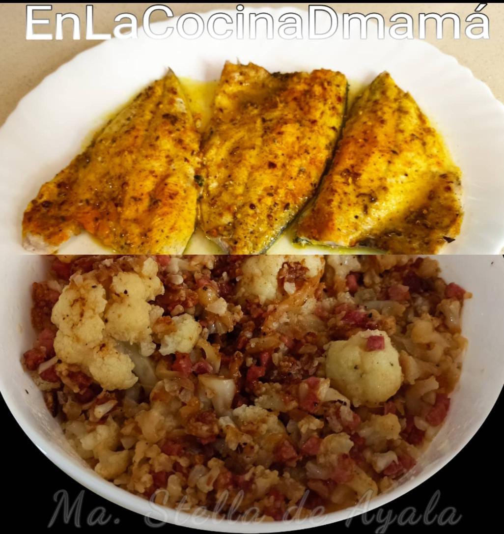 Menú saludable de Pescado con curry y naranja y coliflor salteada con jamón (Bajo en carbohidratos)