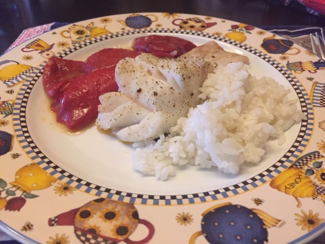 2. Añade al vaso los pimientos, la sal y la pimienta y rehoga 2 min / 120º / giro inverso / vel. cuchara. Sirva inmediatamente el pescado con el arroz y los pimientos.