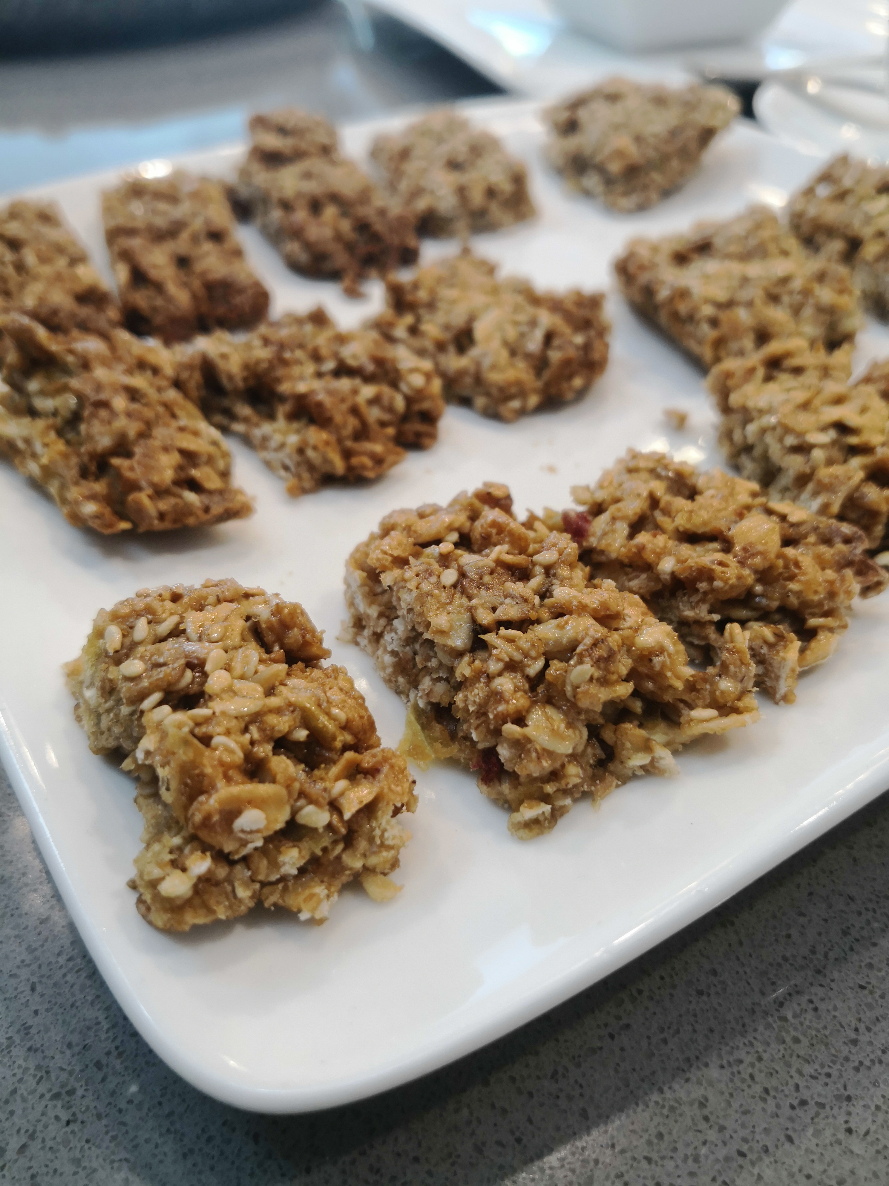 Incorpore el sésamo, el muesli y la miel y programe 3 min/120ºC/vel 2. Vierta la mezcla en el molde preparado y, con una cuchara mojada, nivele la superficie. Marque con un cuchillo el corte de las barritas, espolvoree ligeramente la superficie con 10 g de azúcar moreno y salpique con agua.