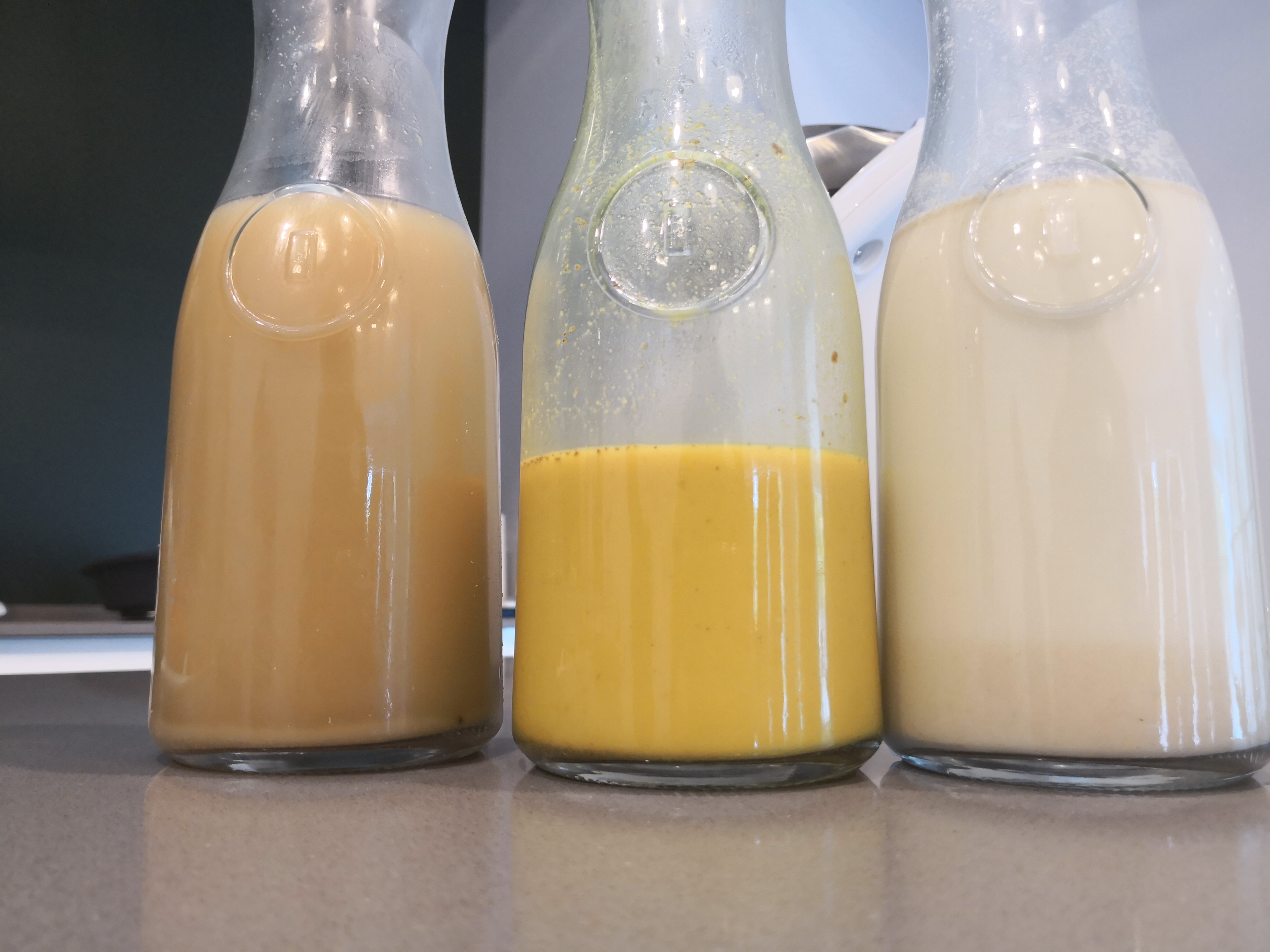 En la foto de izquierda a derecha encuentras la bebida de quinoa, la golden milk, y bebida de avena con dátiles.