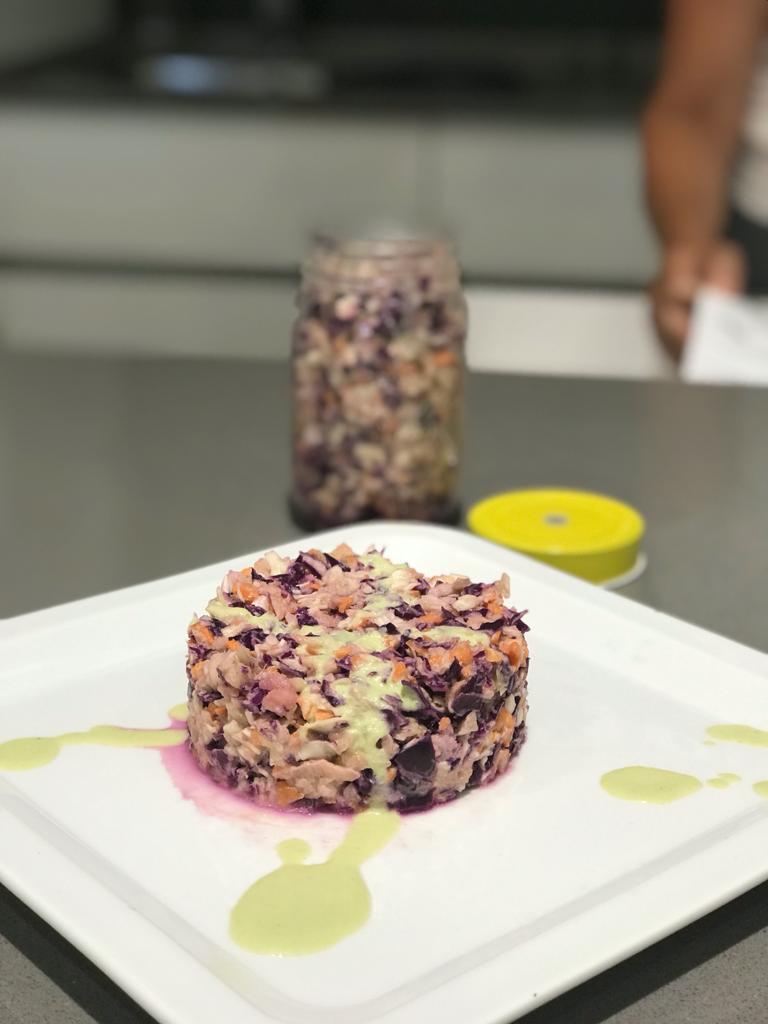 La ponemos en una fuente redonda sobre hojas de endivias u hojas de lechuga baby y en el centro lo que nos sobra. Podemos rellenar tomates, también para llevárnosla al trabajo, playa etc… en un bote hermético de cristal o fiambrera.