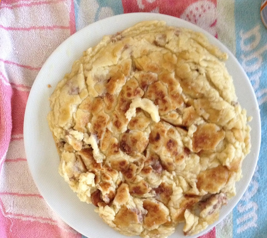 Echamos la mezcla en una sarten, adjuntamos los ajos reservados y remezclamos subiendo a fuego vivo cuando vaya cogiendo color, marcando como una tortilla. (Este proceso puede durar 20 min)
